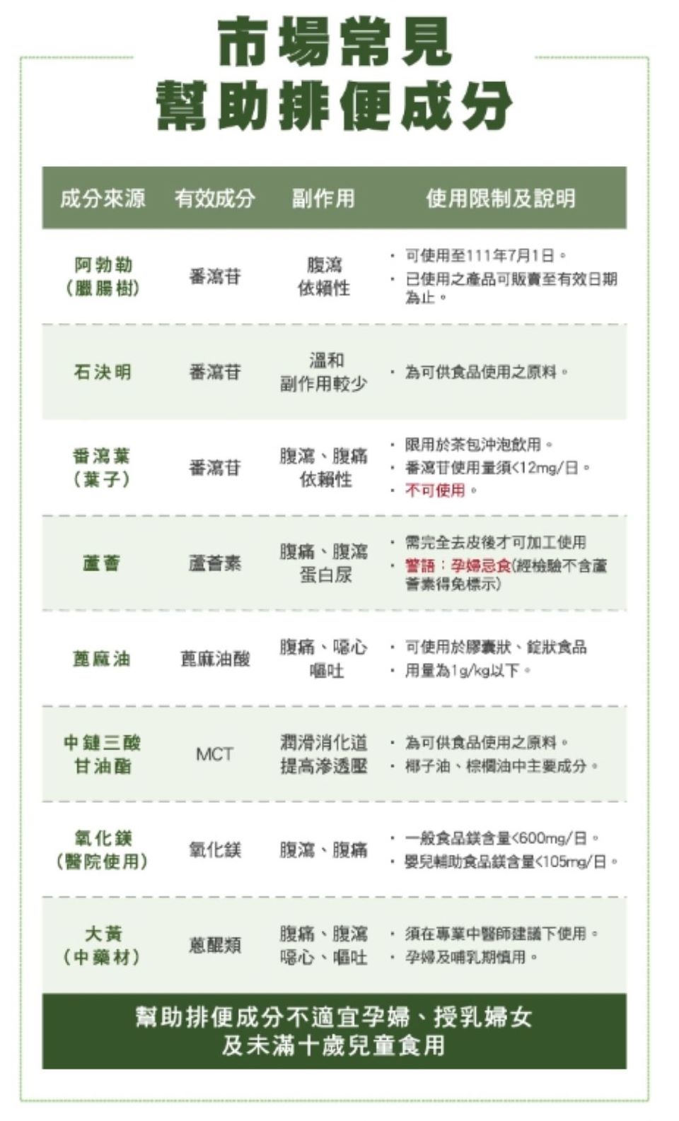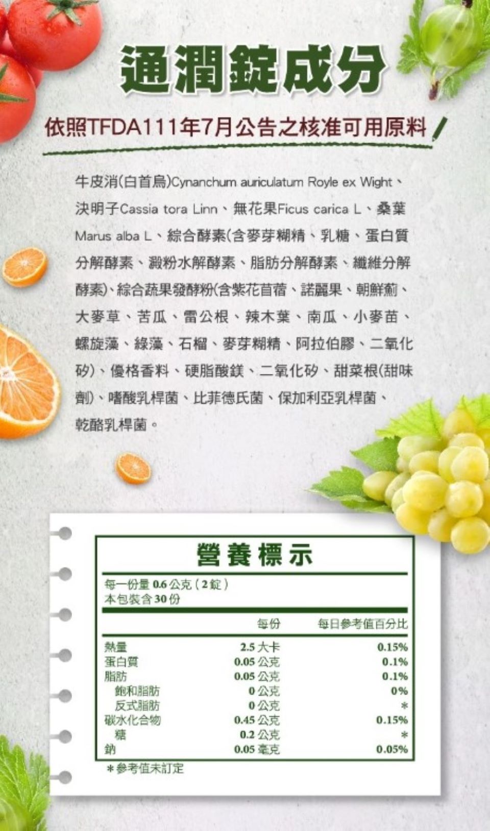 牛皮消(白首烏)、決明子、無花果、桑葉、綜合酵素(含麥芽糊精、乳糖、蛋白質分解酵素、澱粉水解酵素、脂肪分解酵素、纖維分解酵素)、綜合蔬果發酵粉(含紫花苜蓿、諾麗果、朝鮮薊、大麥草、苦瓜、雷公根、辣木葉、南瓜、小麥苗、螺旋藻、綠藻、石榴、麥芽糊精、阿拉伯膠、二氧化矽)、優格香料、硬脂酸鎂、二氧化矽、甜菜根(甜味劑)、嗜酸乳桿菌、比菲德氏菌、保加利亞乳桿菌、乾酪乳桿菌。