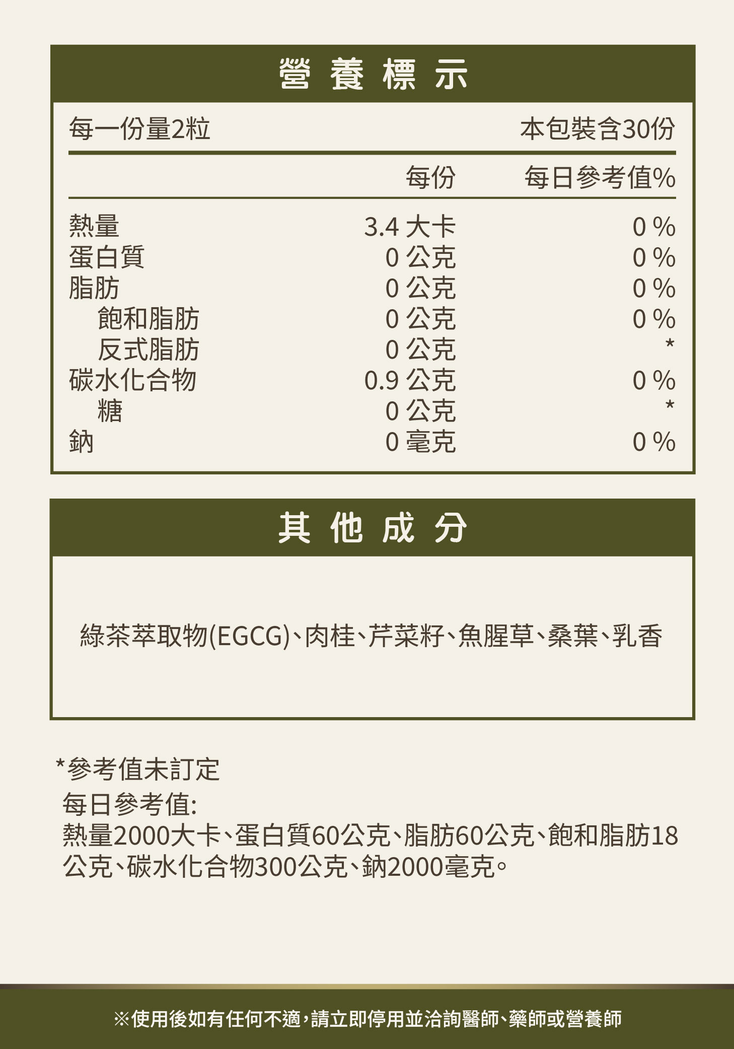 注意事項:本品含有1. EGCG(綠茶萃取物),每日食用限150毫克(本品每份2粒含100毫克)2. 肉桂萃取物,孕婦忌食。