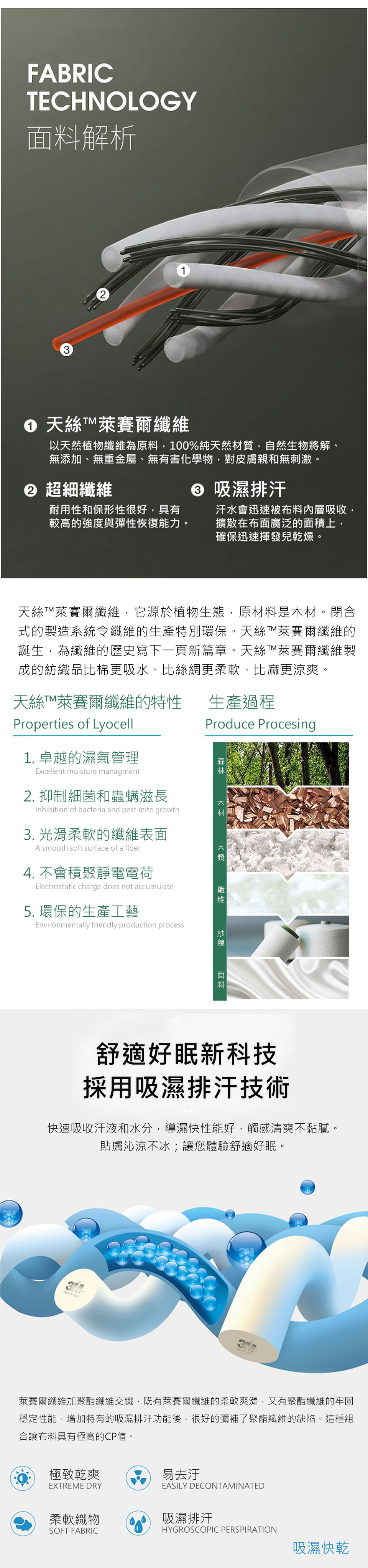 萊賽爾纖維以天然舒適質感馳名,配搭吸濕排汗纖維,性能和功能性俱佳。具有獨特的物理性;可以完善管理濕氣,高織高密布料,絲滑柔順 .環保印染,不含甲醛螢光劑和其他有害人體的添加物。 全程台灣製造,經由多年經驗的裁剪師傅、縫紉師細心製作,品質有保障。◆商品內容物:特大床包x 1件、美式枕套x 2個、鋪棉兩用被套x1件;共四件/組。內容物尺寸:美式枕套:1.5 x 2.5 尺 ( 45 x 75 ±3 公分 )特大床包:6 x 7 尺 ( 180 x 210 ±3 公分 );可包覆床高30公分雙人鋪棉兩用被套:6 x 7 尺 ( 180x 210公分 ±5 % )表布材質:50%萊賽爾纖維 + 50%聚酯纖維 (支數40S 織數200織)兩用被鋪棉材:100%聚酯纖維 (羽絲棉)產地:台灣 保養方式:◎商品可水洗、機洗。◎建議清洗時可放入大型洗衣袋後再清洗,同時,清洗時淺色的要與深色分開洗滌,避免顏色互染。◎勿使用漂白劑洗滌。◎可低溫熨燙。◎正常請洗程序即可。顏色:如圖,網頁產品因拍攝關係,與實品略有差異,實品顏色更佳 。產品圖僅供參考,不含拍攝道具,實際內容以包裝規格為主。※因布料裁切位置的不同,部份花版可能會與商品圖略有出入,請以收到的實品為主。◆注意事項:網路購物享有鑑賞期,非試用期,個人衛生用品,經拆封使用後恕不接受退換貨。(請於鑑賞期內確定尺寸規格無誤再使用)商品如經拆封、使用、下水、或拆解以致缺乏完整性及失去再販售價值時,恕無法退貨!
