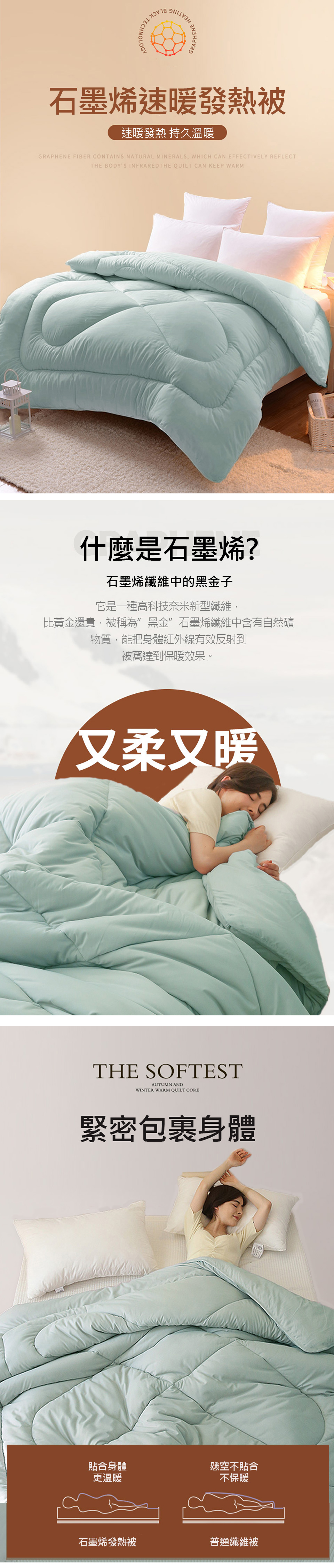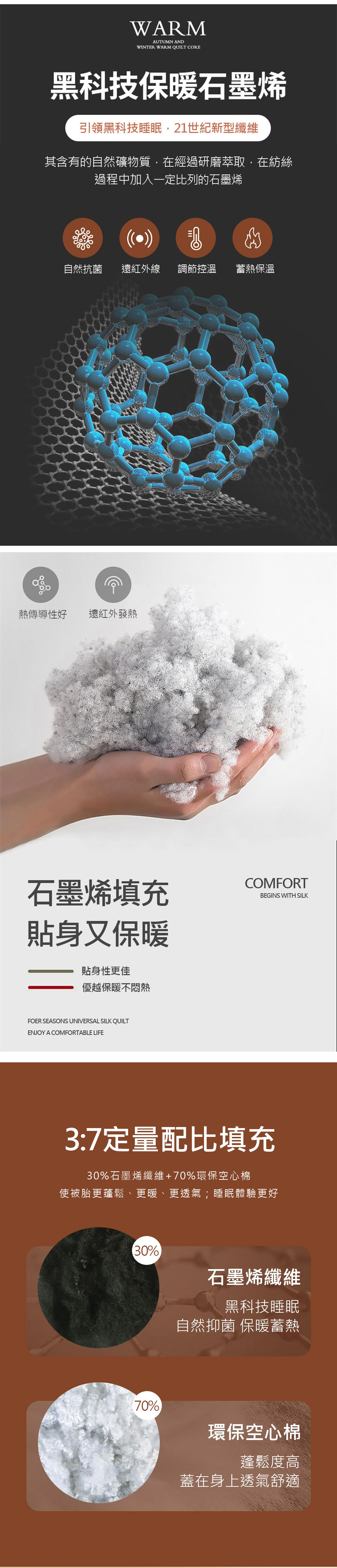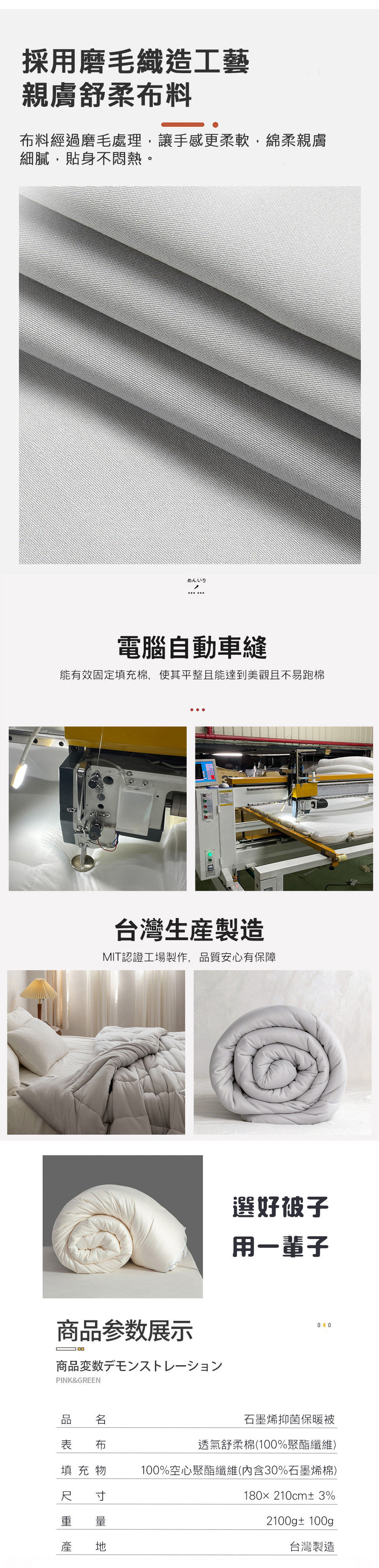 【石墨烯被特色】奈米石墨烯 自然抑菌遠紅外發熱 整夜保暖台灣製造 嚴選品質【產品配件/尺寸】表布:超細纖維舒柔棉 (100% polyester)填充物:100%聚酯纖維(內含30%石墨烯纖維)產地:台灣尺寸:180x210cm (6x7尺)±誤差值5%重量:2100g ±100g保養方式:◎可水洗/可乾洗/不可烘乾/不可熨燙/不可漂白/勿使用強力漂白清潔劑◎可於陰涼處或暖日下進行曝曬;請避開中午烈日時段。顏色:如圖,網頁產品因拍攝關係,與實品略有差異,實品顏色更佳 。產品圖僅供參考,不含拍攝道具,實際內容以包裝規格為主。◆注意事項: 網路購物享有鑑賞期,非試用期,個人衛生用品,經拆封使用後恕不接受退換貨。(請於鑑賞期內確定尺寸規格無誤再使用)商品如經拆封、使用、下水、或拆解以致缺乏完整性及失去再販售價值時,恕無法退貨!