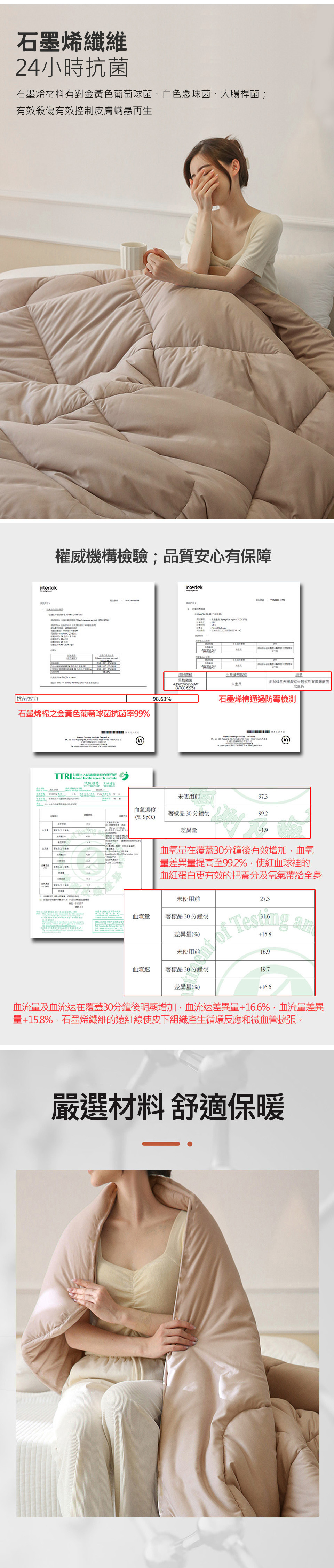 【石墨烯被特色】奈米石墨烯 自然抑菌遠紅外發熱 整夜保暖台灣製造 嚴選品質【產品配件/尺寸】表布:超細纖維舒柔棉 (100% polyester)填充物:100%聚酯纖維(內含30%石墨烯纖維)產地:台灣尺寸:180x210cm (6x7尺)±誤差值5%重量:2100g ±100g保養方式:◎可水洗/可乾洗/不可烘乾/不可熨燙/不可漂白/勿使用強力漂白清潔劑◎可於陰涼處或暖日下進行曝曬;請避開中午烈日時段。顏色:如圖,網頁產品因拍攝關係,與實品略有差異,實品顏色更佳 。產品圖僅供參考,不含拍攝道具,實際內容以包裝規格為主。◆注意事項: 網路購物享有鑑賞期,非試用期,個人衛生用品,經拆封使用後恕不接受退換貨。(請於鑑賞期內確定尺寸規格無誤再使用)商品如經拆封、使用、下水、或拆解以致缺乏完整性及失去再販售價值時,恕無法退貨!