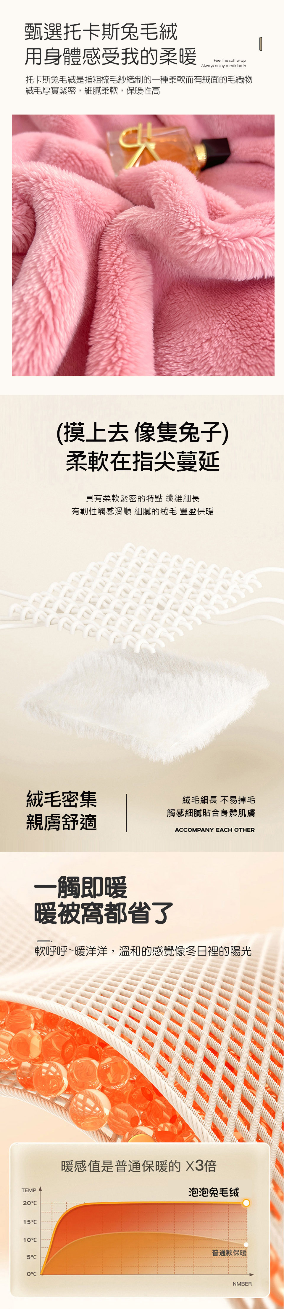 【產品特色】 享受親柔舒眠的體驗!托卡斯兔絨毯;採用泡泡壓花工藝,美觀實用,讓您無論在沙發、電腦桌前休憩或是床鋪上睡眠,都能享有即刻的保暖!簡約素雅的顏色,適合全家大小使用!親膚舒適,令人愛不釋手的聖品,冬季保暖最佳首選喔~~【產品配件/尺寸】商品組合:托斯卡泡泡兔毛絨毯 x 1件 尺寸:150x200cm ±5% 材質:托斯卡兔毛絨 (100%聚酯纖維)保養方式:可水洗、機洗(建議放入洗衣袋中洗滌)使用中性洗滌劑。請勿漂白。洗滌後;於暖日中曝曬。可使用低溫烘乾。 顏色:如圖,網頁產品因拍攝關係,與實品略有差異,實品顏色更佳 。產品圖僅供參考,不含拍攝道具,實際內容以包裝規格為主。※因布料裁切位置的不同,部份花版可能會與商品圖略有出入,請以收到的實品為主。◆注意事項: 網路購物享有鑑賞期,非試用期,個人衛生用品,經拆封使用後恕不接受退換貨。(請於鑑賞期內確定尺寸規格無誤再使用)商品如經拆封、使用、下水、或拆解以致缺乏完整性及失去再販售價值時,恕無法退貨!