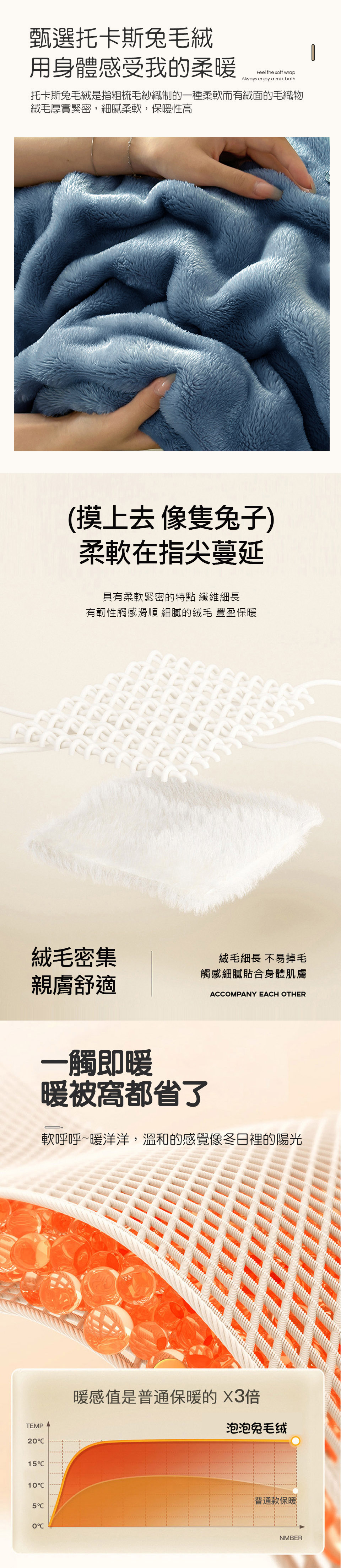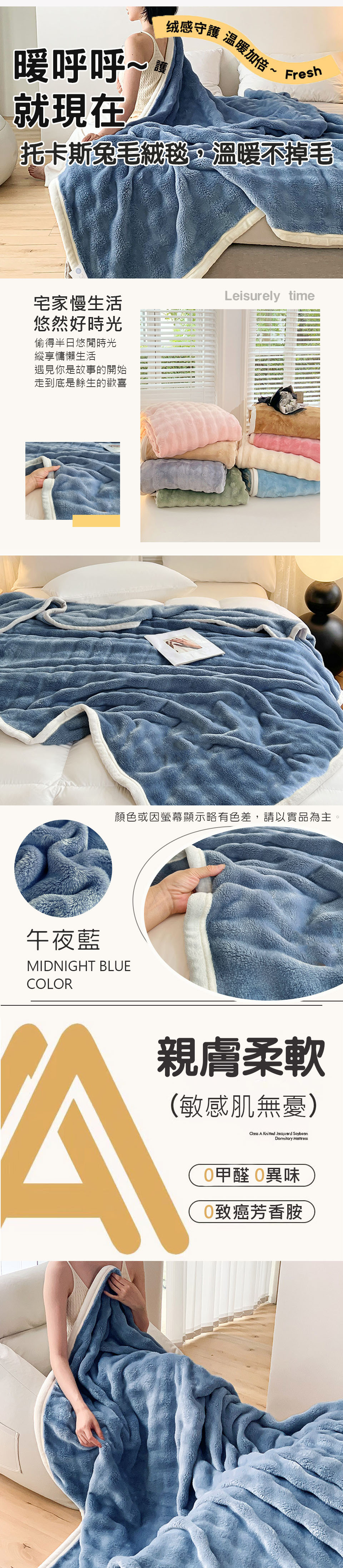 【產品特色】 享受親柔舒眠的體驗!托卡斯兔絨毯;採用泡泡壓花工藝,美觀實用,讓您無論在沙發、電腦桌前休憩或是床鋪上睡眠,都能享有即刻的保暖!簡約素雅的顏色,適合全家大小使用!親膚舒適,令人愛不釋手的聖品,冬季保暖最佳首選喔~~【產品配件/尺寸】商品組合:托斯卡泡泡兔毛絨毯 x 1件 尺寸:150x200cm ±5% 材質:托斯卡兔毛絨 (100%聚酯纖維)保養方式:可水洗、機洗(建議放入洗衣袋中洗滌)使用中性洗滌劑。請勿漂白。洗滌後;於暖日中曝曬。可使用低溫烘乾。 顏色:如圖,網頁產品因拍攝關係,與實品略有差異,實品顏色更佳 。產品圖僅供參考,不含拍攝道具,實際內容以包裝規格為主。※因布料裁切位置的不同,部份花版可能會與商品圖略有出入,請以收到的實品為主。◆注意事項: 網路購物享有鑑賞期,非試用期,個人衛生用品,經拆封使用後恕不接受退換貨。(請於鑑賞期內確定尺寸規格無誤再使用)商品如經拆封、使用、下水、或拆解以致缺乏完整性及失去再販售價值時,恕無法退貨!