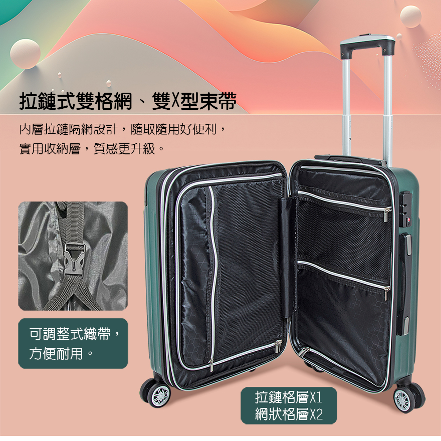 特色:防爆拉鏈、掛包扣、雙內裡隔網、雙X型束帶、TSA海關鎖、鋁合金拉桿、360度飛機輪、加大15-30%