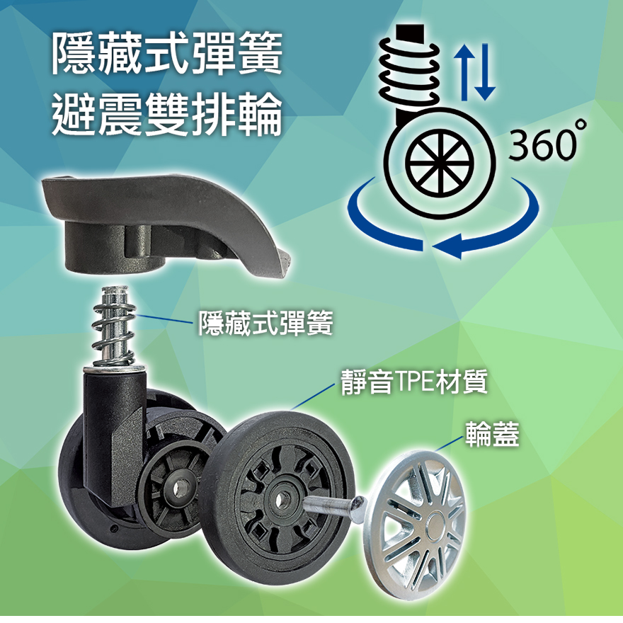 特色:TSA海關鎖、雙內裡隔網、加大15-30%、雙X型束帶、大片鋁護角、鋁合金拉桿、掛包扣、防爆雙層拉鏈、PC卡夢紋膜片、內避震彈簧雙排輪