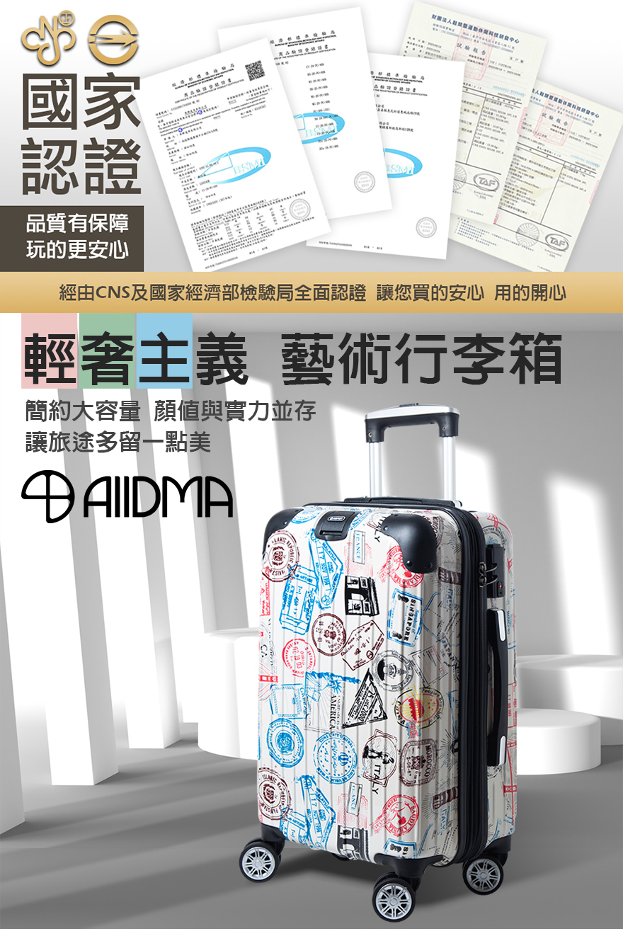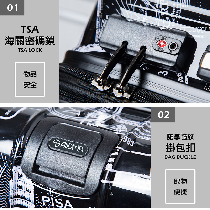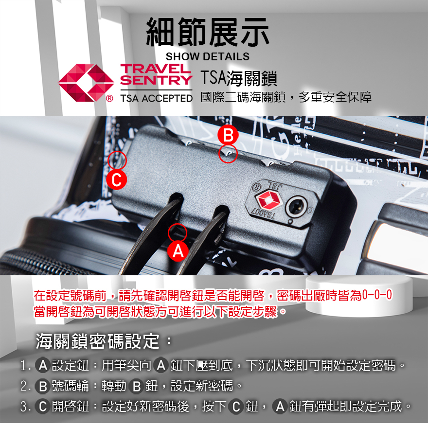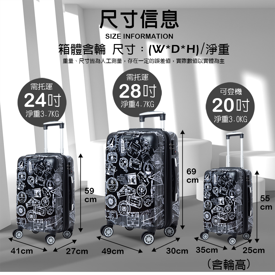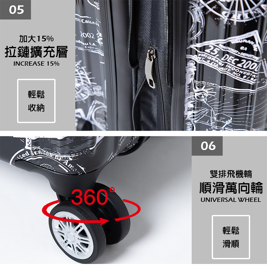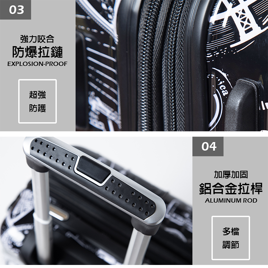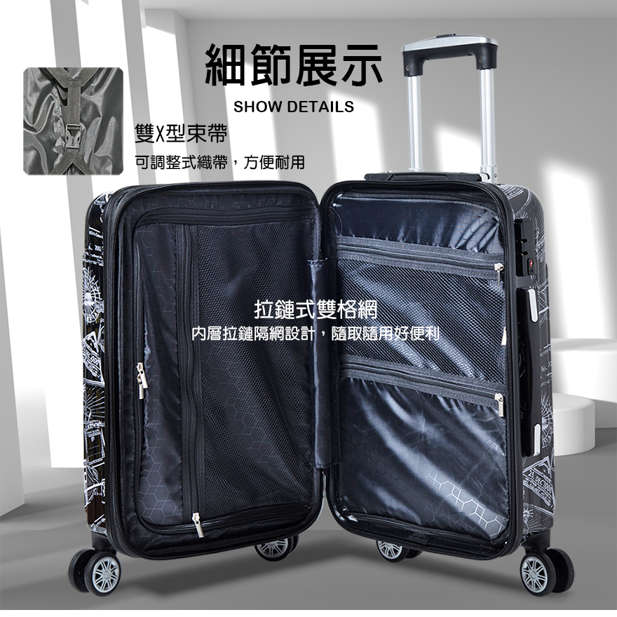 特色:PC+ABS防爆拉鏈、掛包扣、雙內裡隔網、雙X型束帶、TSA海關鎖、鋁合金拉桿、360度飛機輪、加大15-30%