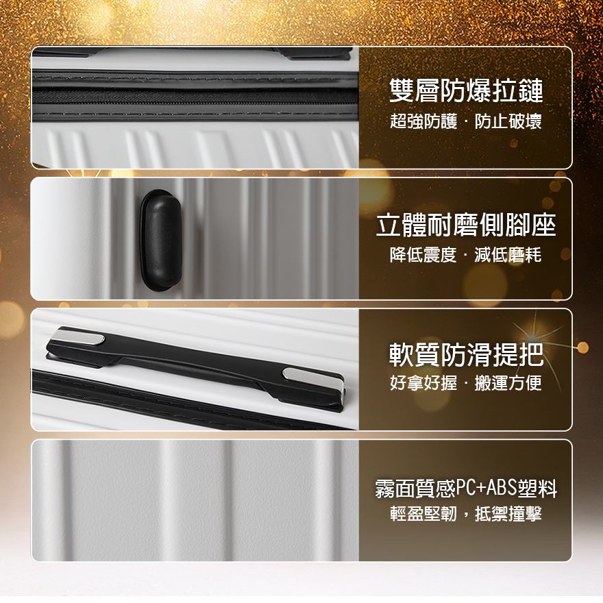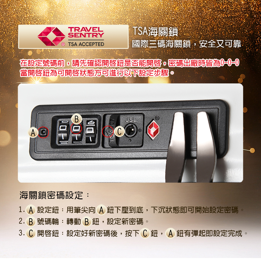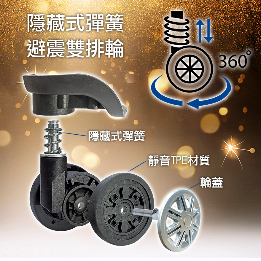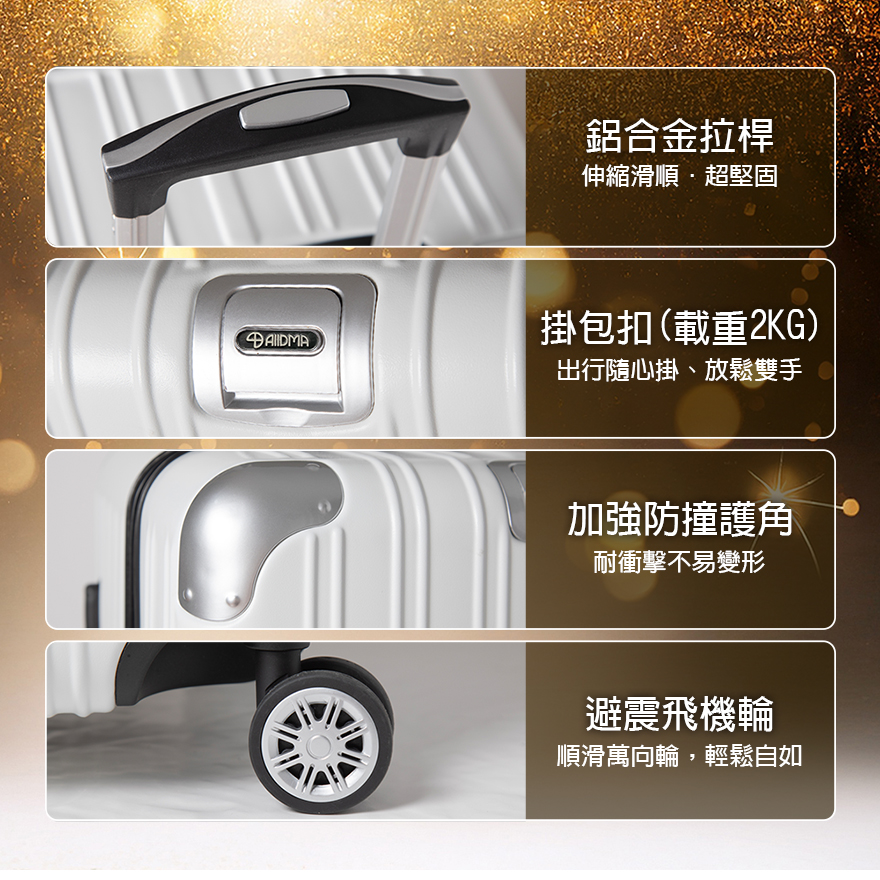 特色:掛包扣、防爆拉鏈、TSA海關鎖、內裡隔網、組合式隔板層、鋁合金拉桿、後背防磨腳座、60mm飛機輪