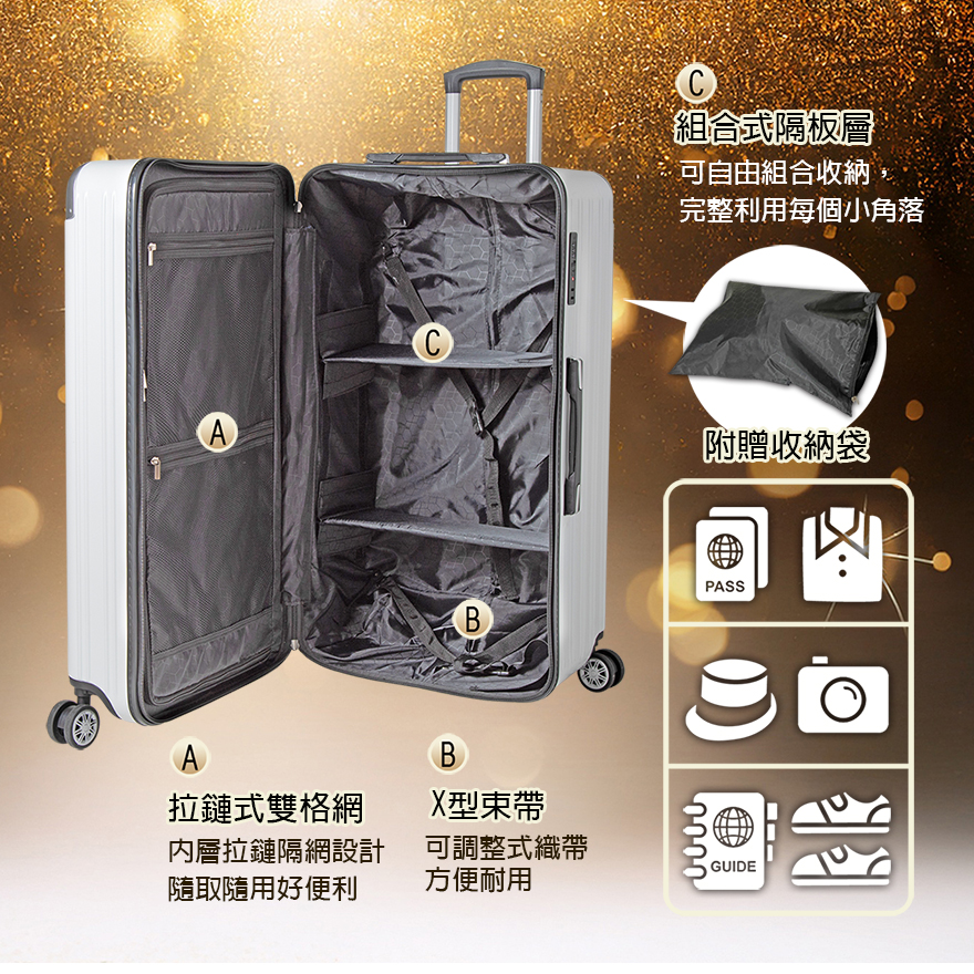 特色:掛包扣、防爆拉鏈、TSA海關鎖、內裡隔網、組合式隔板層、鋁合金拉桿、後背防磨腳座、60mm飛機輪