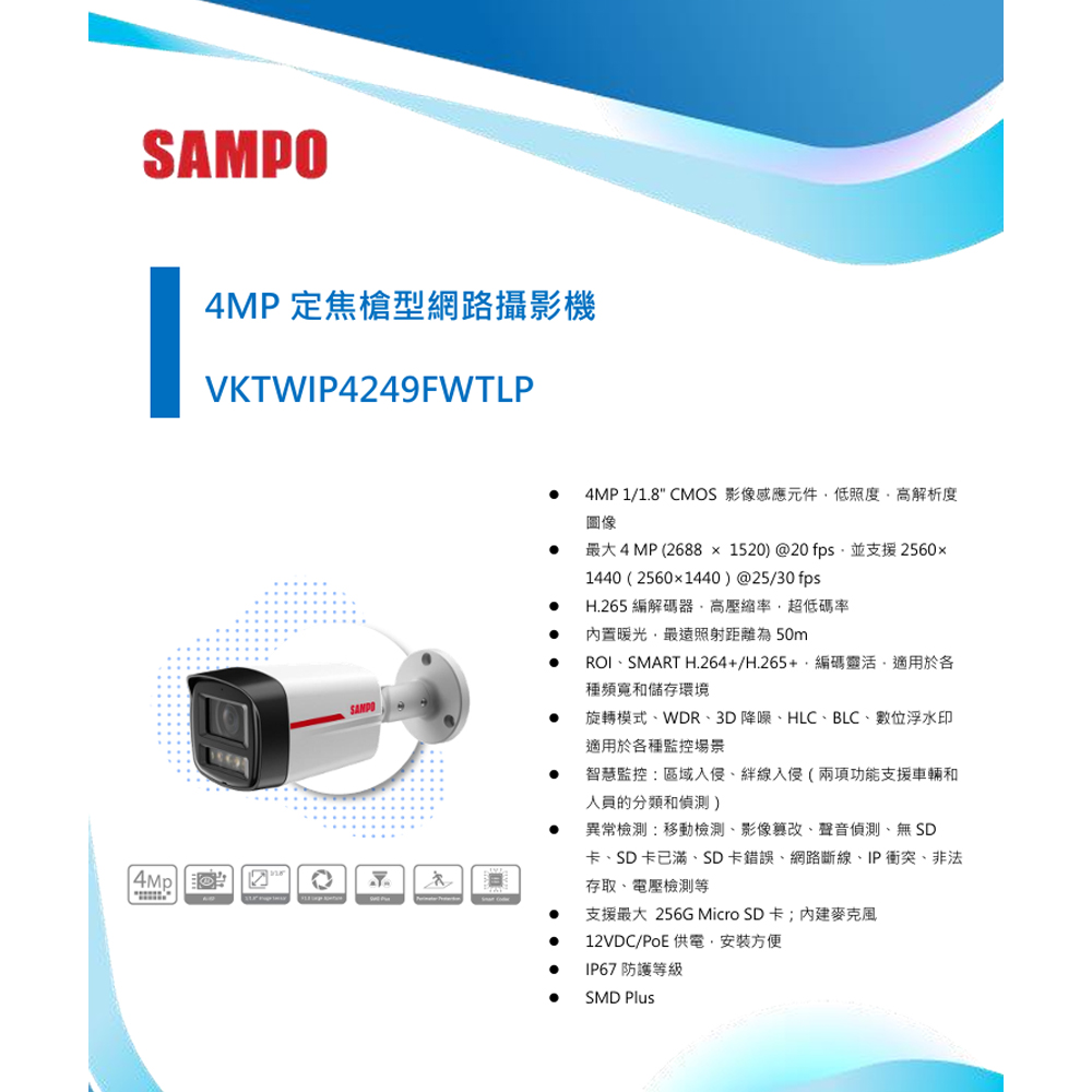 昌運監視器 SAMPO 聲寶 VKTWIP4249FWTLP 4MP定焦槍型網路攝影機 暖光照射距離為50m