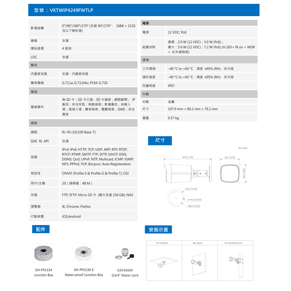 -異常檢測:移動檢測、影像篡改、聲音偵測、無SD卡、SD卡已滿、SD卡錯誤、網路斷線、IP衝突、非法存取、電壓檢測等