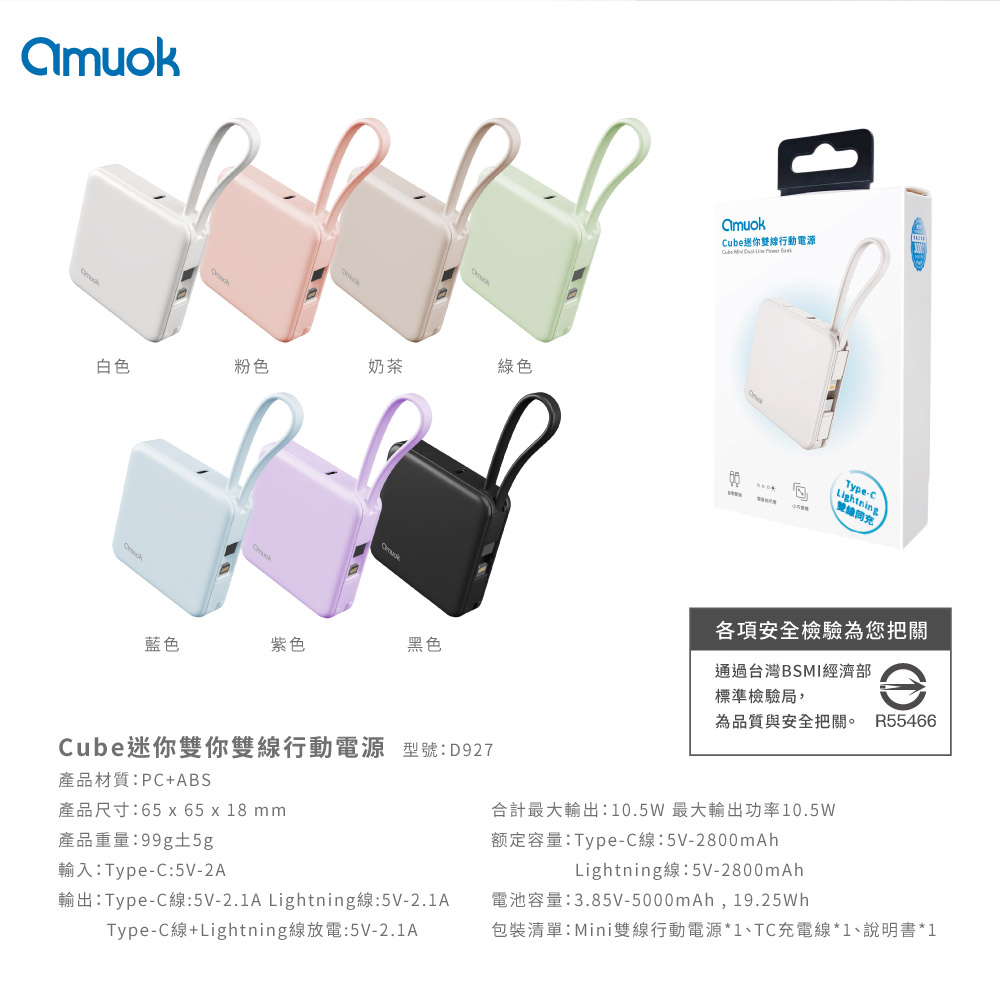 ● 重量僅99g,輕巧零負擔● 多重保護設計,充電更安心● 自帶Type-C、Lightning線● 馬卡龍繽紛色系〈商品規格〉amuok Cube迷你雙你雙線行動電源型 號:D927產品材質:PC+ABS產品尺寸:65×65×18 mm產品重量:99g+5g輸 入:Type-C:5V⎓2A輸 出:Type-C線:5V⎓2.1A Lightning線:5V⎓2.1A Type-C線+Lightning線:5V⎓2.1A合計最大輸出:10.5W最大輸出功率:10.5W額定容量:Type-C線:5V-2800mAhLightning線:5V-2800mAh電池容量:3.85V-5000mAh ,19.25Wh包裝清單:Mini雙線行動電源×1、TC充電線×1、說明書×1