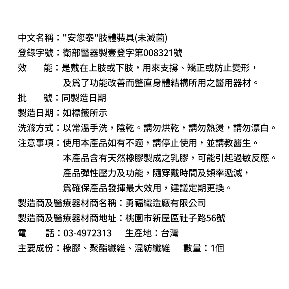 1、商品組合/規格:【anytime安您泰】高彈力透氣髕骨固定型護膝VA-7152(未滅菌)2入2、醫療器材許可證◆核定品名:"安您泰"肢體裝具(未滅菌)◆核准字號:衛部醫器製壹登字第008321號◆藥商名稱:勇福織造廠有限公司◆製造廠名稱:勇福織造廠有限公司◆製造廠地址:桃園市新屋區社子路56號3、藥商許可執照◆許可執照字號:北市衛器販(信)字第6201077996號◆藥商名稱:葛拉蒂國際企業有限公司◆藥商地址:新北市三重區重新路4段256號1樓◆藥商諮詢專線電話:02-2586-55384、製造日期:如外包裝標示5、有效期間或保存期限:如外包裝標示7、「消費者使用前應詳閱產品說明書」