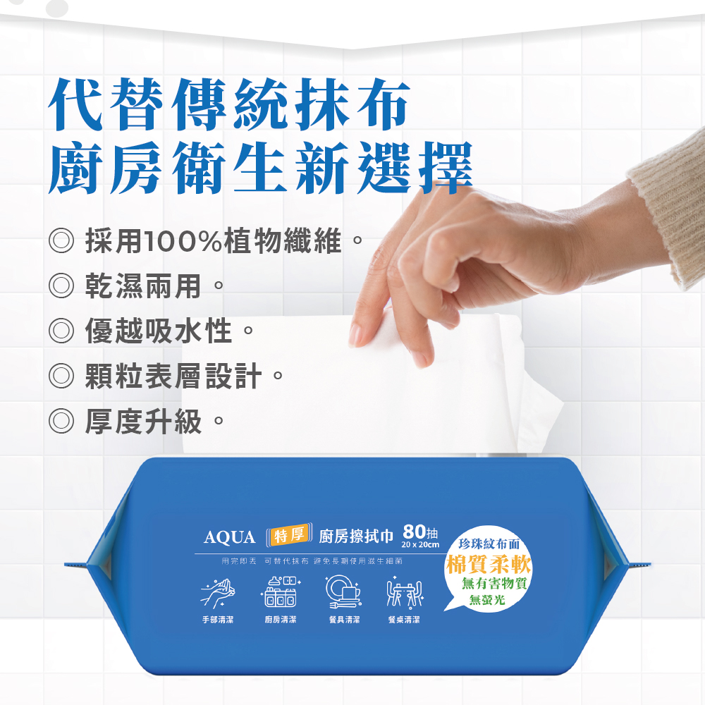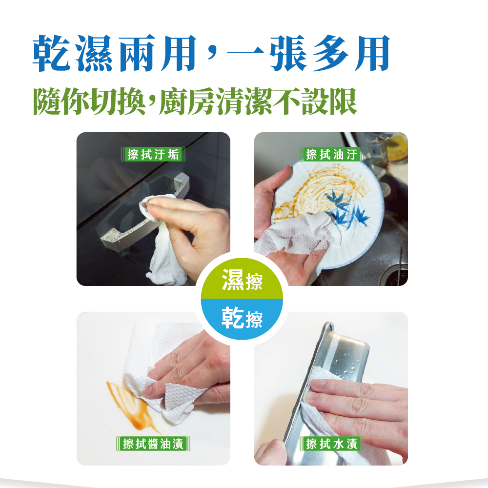 •採用100%植物纖維•乾濕兩用,一張多用•優越吸水性,擦拭更俐落•顆粒表層設計,高效擦拭力•厚度升級,抗拉扯更耐用