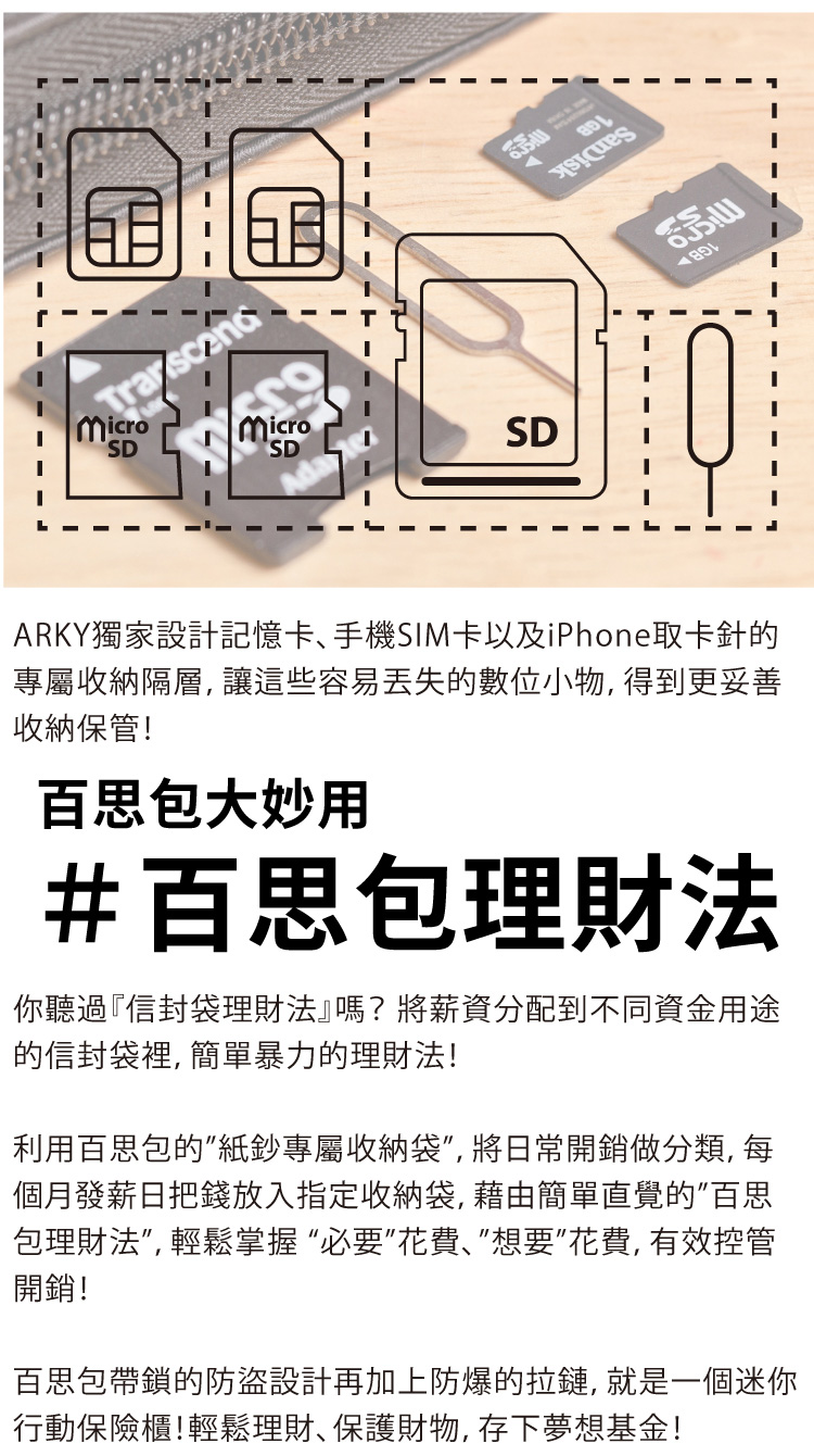 ◆ 防爆拉鍊×防盜拉鍊密碼鎖設計 ◆ 採用TPO強韌無毒環保材質防割穿內版 ◆ 獨家設計紙鈔、卡片等活頁收納袋 ◆ 特製SIM卡、記憶卡小物專屬隔層 ◆ 運用紙鈔收納袋分類理財 兼具行動保險箱功能