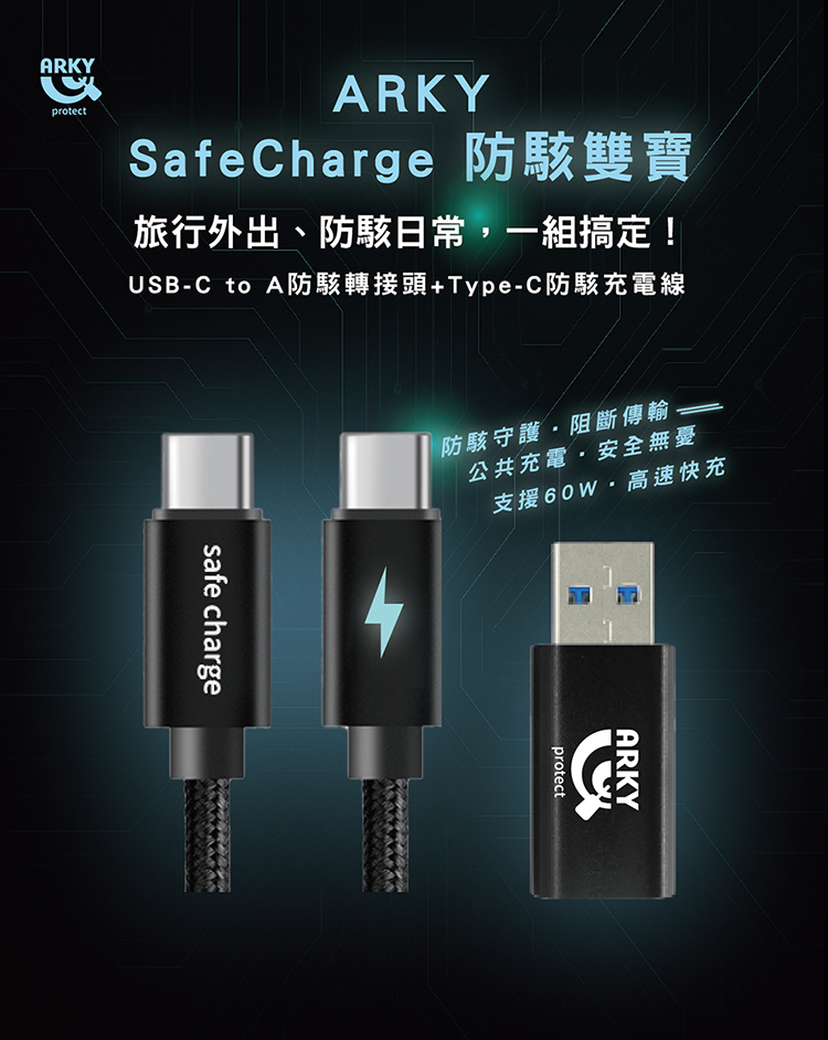 ARKY SafeCharge 防駭雙寶 USB-C to A 防駭轉接頭 + Type-C 防駭充電線 (60W快充)