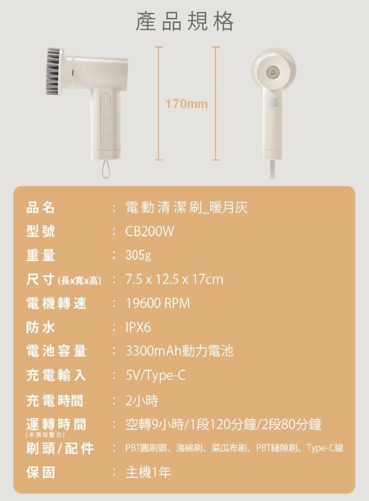配件:主機、4種刷頭(圓刷/海綿刷/菜瓜布刷/PBT刷)、說明書(含保卡)