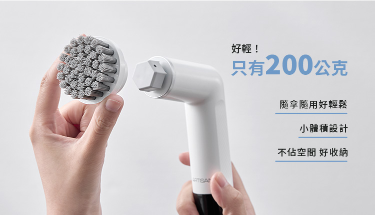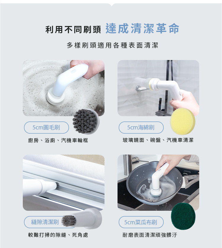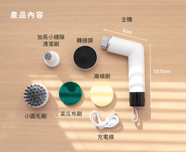 配件:主機、4種刷頭(圓刷/海綿刷/菜瓜布刷/縫隙刷)、充電線、說明書(含保卡)