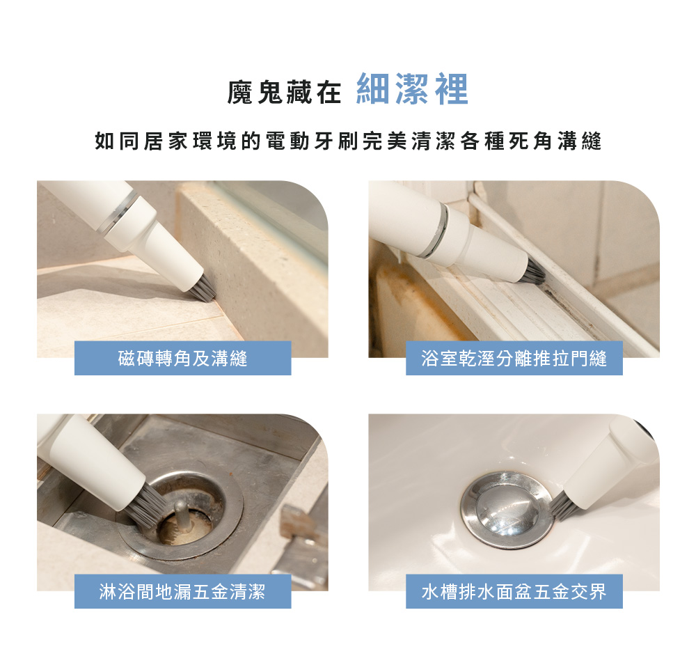 配件:主機、4種刷頭(圓刷/海綿刷/菜瓜布刷/縫隙刷)、充電線、說明書(含保卡)