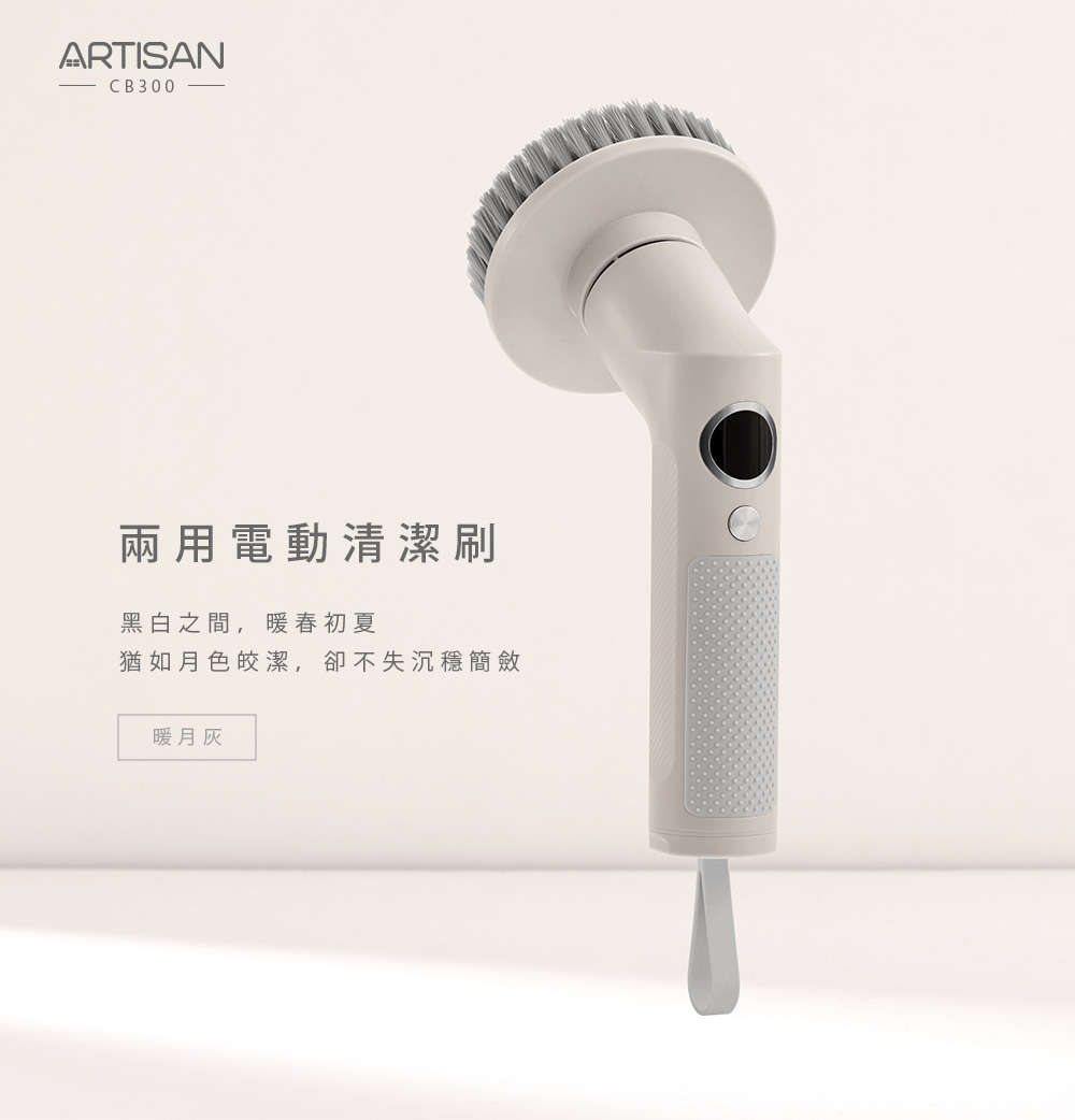 【商品特色】● IPX6防水等級● 大刷頭及75-110cm任意調伸縮桿● 無線設計,2段速切換● 一鍵操作,6種刷頭運用● 液晶螢幕顯示剩餘電量及段數● 高速清潔,PBT耐用刷頭可恢復原狀● 水槽/瓦斯爐/碗盤/磁磚/玻璃/縫隙● Type-C充電-快速便利 ● 矽膠掛勾-方便吊掛● 保固:主機保固1年【商品規格】品牌:ARTISAN(台灣品牌)品名:USB兩用電動清潔刷-暖月灰型號:CB300尺寸:5*9.5*21cm重量:1039g 產地:中國 電池容量:2400mAh動力電池電源:Type-C充電(約2小時),5V配件:主機、伸縮桿、6種刷頭、充電線、說明書(含保卡)國際條碼:4713294770844保固:主機保固1年(不含耗材配件)-電動刷為輕鬆使用設計,不需刻意一直重壓。-主機可用水沖洗(充電孔需關閉),不可泡在水裡。-感受到異常壓力,會啟動馬達保護自動停機安全設計。