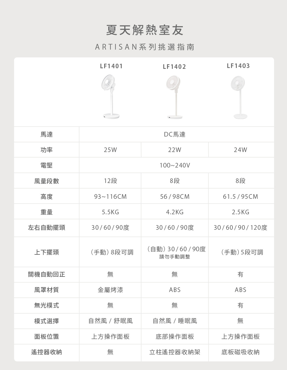 【商品特色】● 日本品牌DC馬達● 18片雙層扇葉,送風更廣● 8段風速,8小時定時關機● 3種出風模式(一般/自然/舒眠)● 靈活高度調整(56-98cm)● 上下左右自動擺頭30~90°● 冷暖房,換季,循環室內空氣● 附遙控器【商品規格】品牌:ARTISAN(台灣品牌) 品名:14吋3D雙層節能風扇型號:LF1402電壓:24V(請使用110V插座連接隨附變壓器)功率:22W尺寸:35 x 35 x 56-98cm重量:4.2kg設計:台灣設計產地:中國製造配件:電風扇、遙控器、說明書(含保卡)保固:主機1年保固(將發票或出貨單與保卡一起保留,視為購買憑證)國際條碼:4713294770721商品驗證識別碼:R3D016【注意事項】● 此商品不提供試用服務,商品一經使用不接受退換貨或索取整新費。● 本賣場開立電子發票,需要的消費者,請在備註留EMAIL,廠商會發MAIL給您,謝謝。
