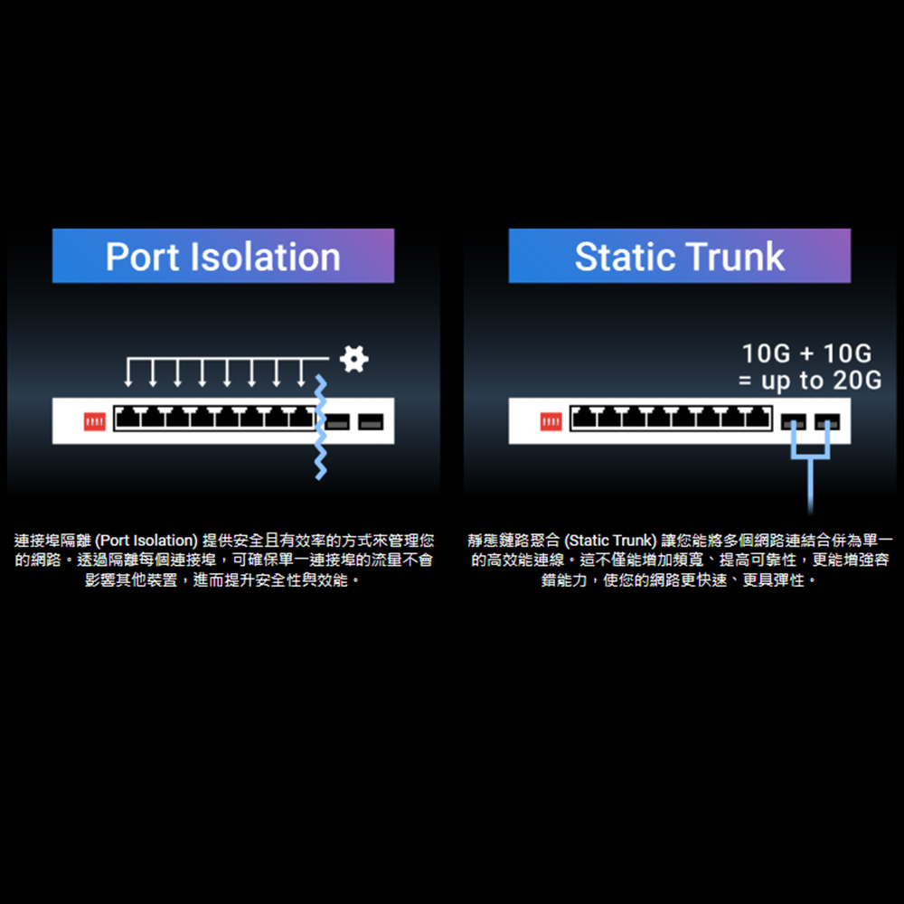 -升級版2.5G連接埠與10G SFP+ : 使用標準CAT5e網路線即可無縫升級至 2.5G,享受更高速的網路效能。