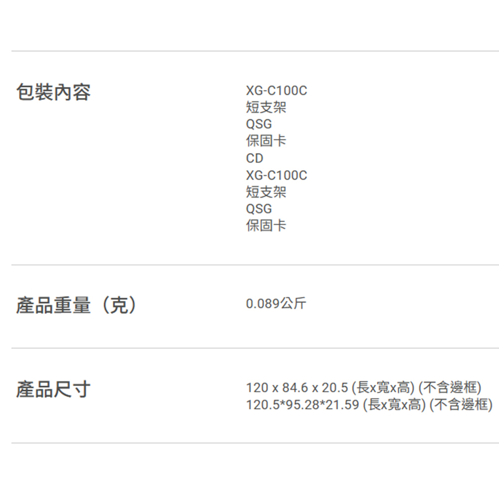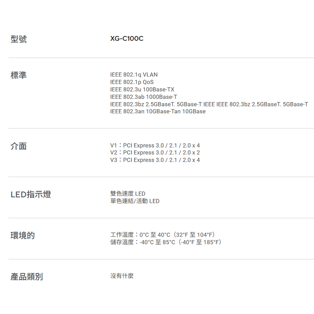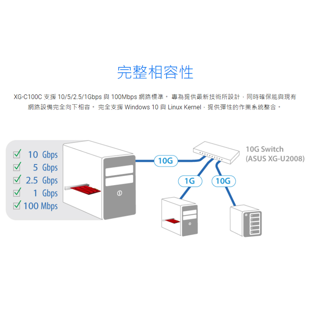 -完整相容性 : XG-C100C相容於現行網路標準,包含10/5/2.5/1Gbps與100Mbps各種傳輸速度,提供無縫向下相容性。