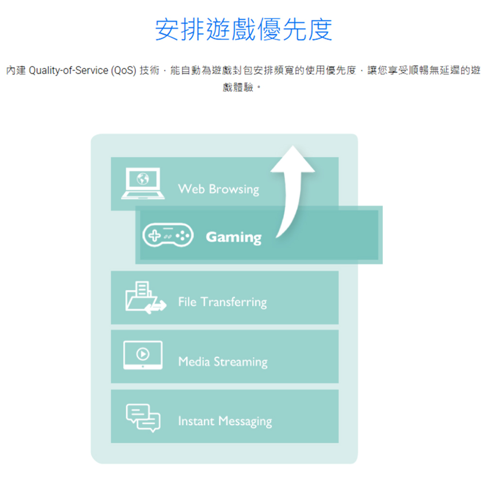 -安排遊戲優先度 : 內建Quality-of-Service (QoS)科技,讓您輕鬆安排頻寬與支援遊戲封包的優先度,享受流暢的遊戲體驗。