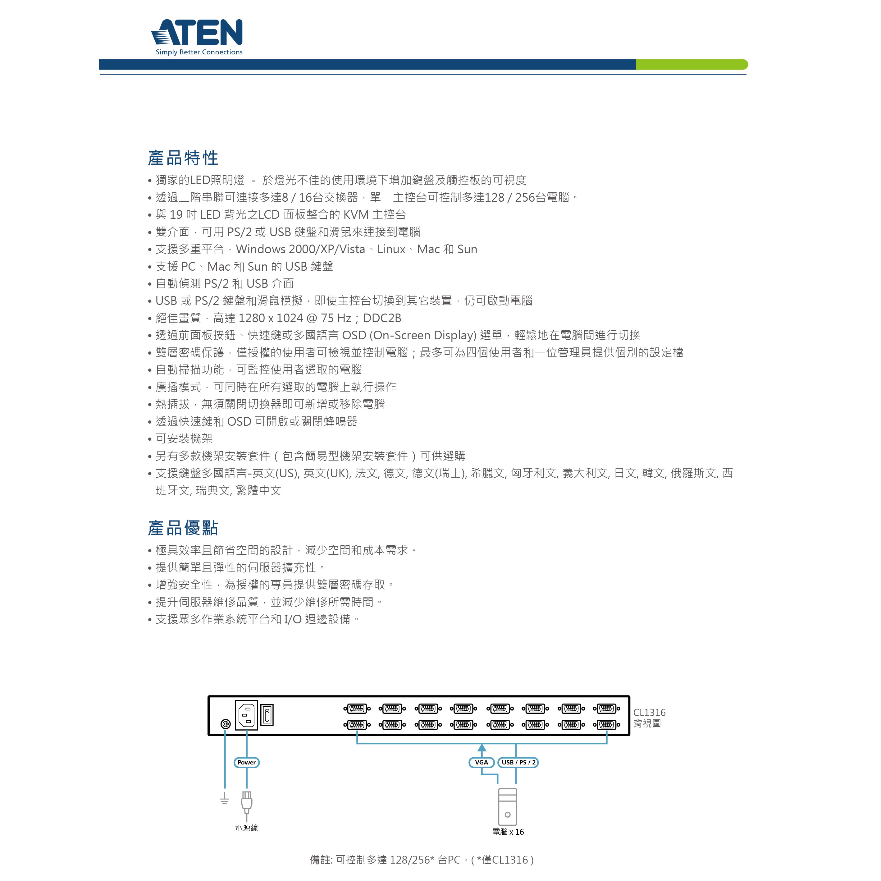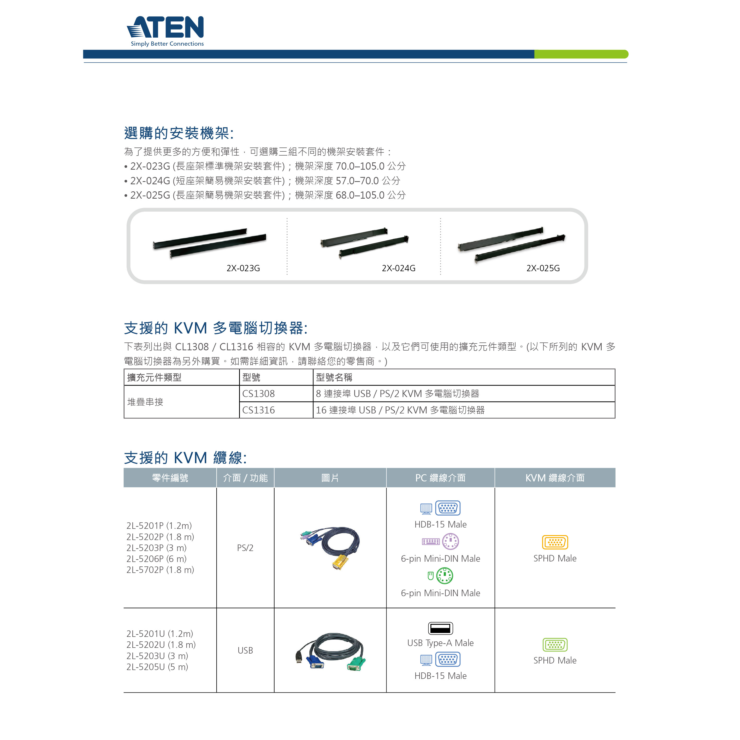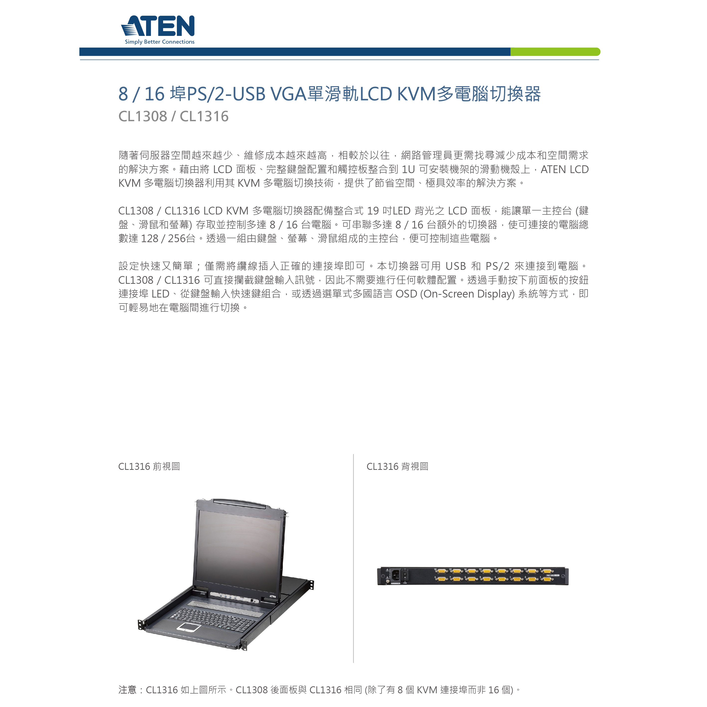 昌運監視器 ATEN 宏正 CL1308N 8埠PS/2-USB VGA單滑軌LCD KVM多電腦切換器
