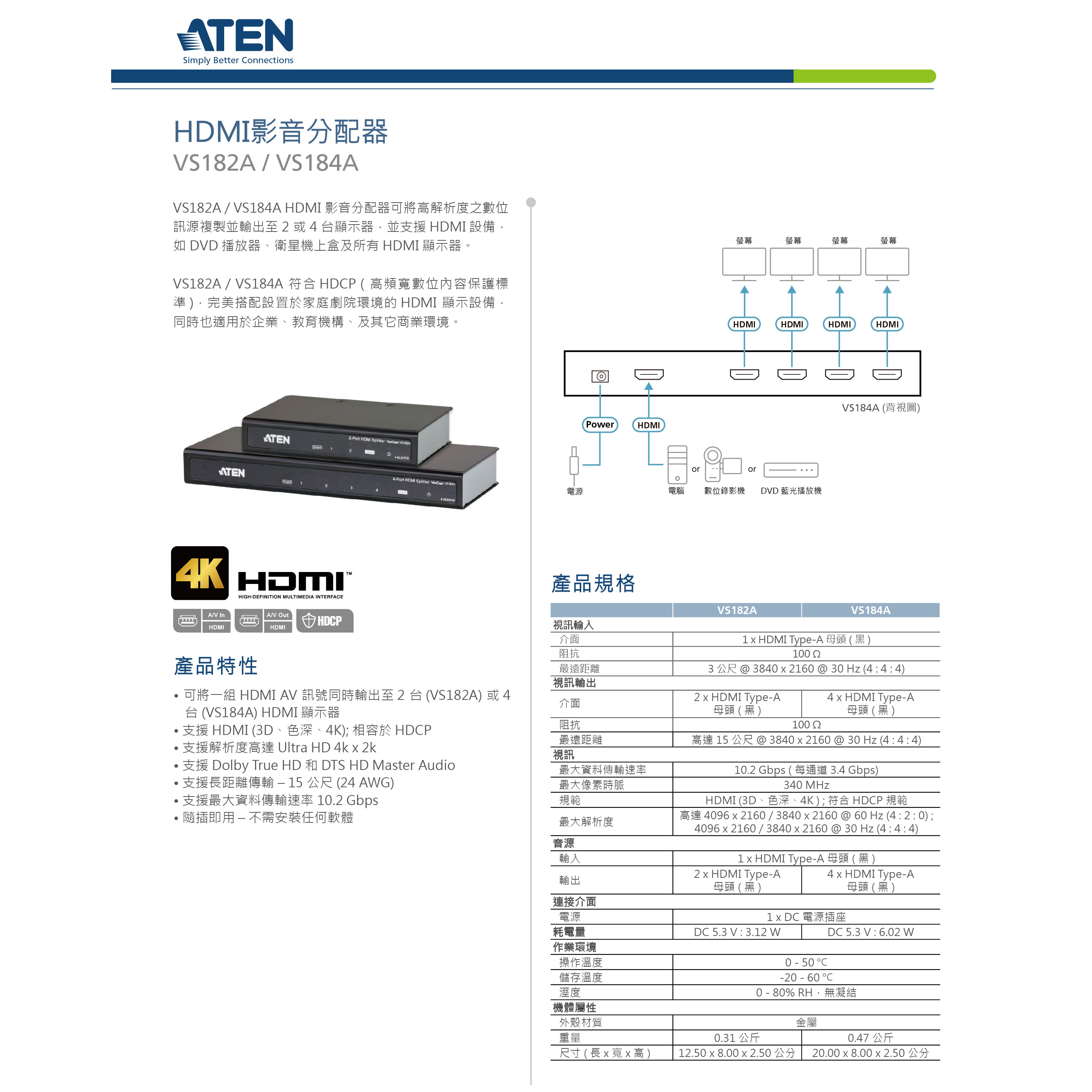 昌運監視器 ATEN 宏正 VS184A 4埠4K HDMI影音分配器