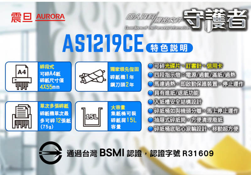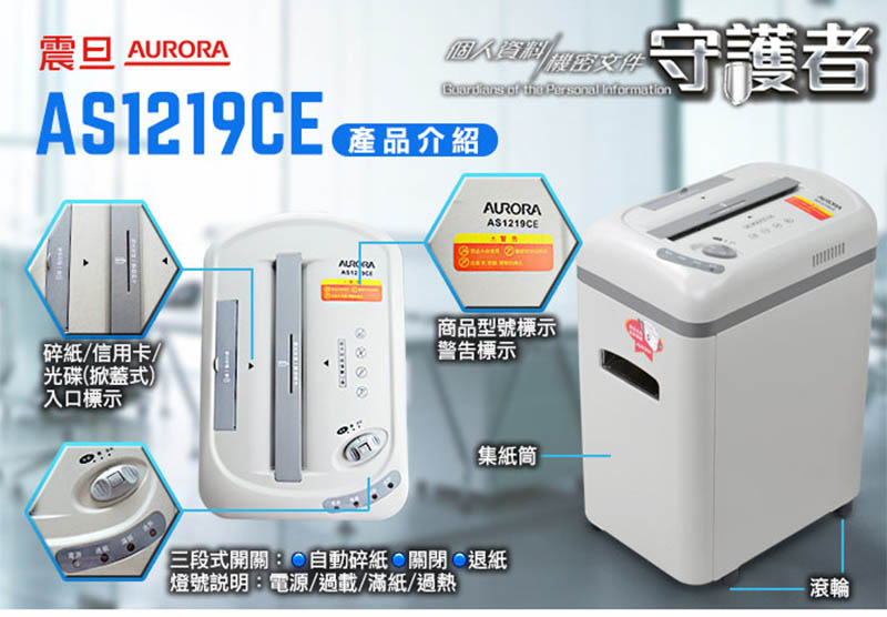 AURORA 震旦 碎段式 4x55 mm 12張 15L 碎紙機 /台 AS1219CE (可碎CD、信用卡)