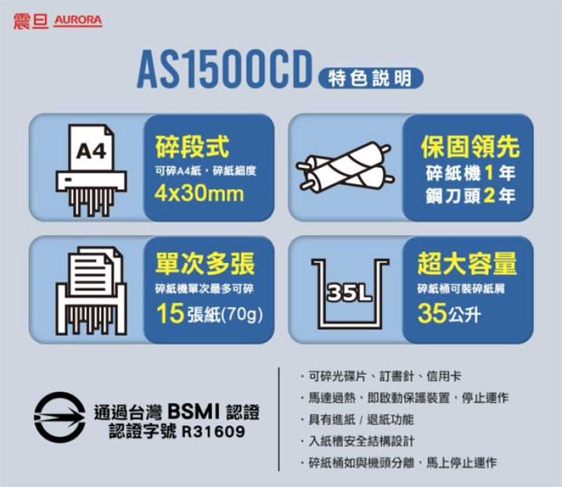 AURORA 震旦 碎段式 4x30 mm 15張 35L 碎紙機 /台 AS1500CD (可碎CD、信用卡)
