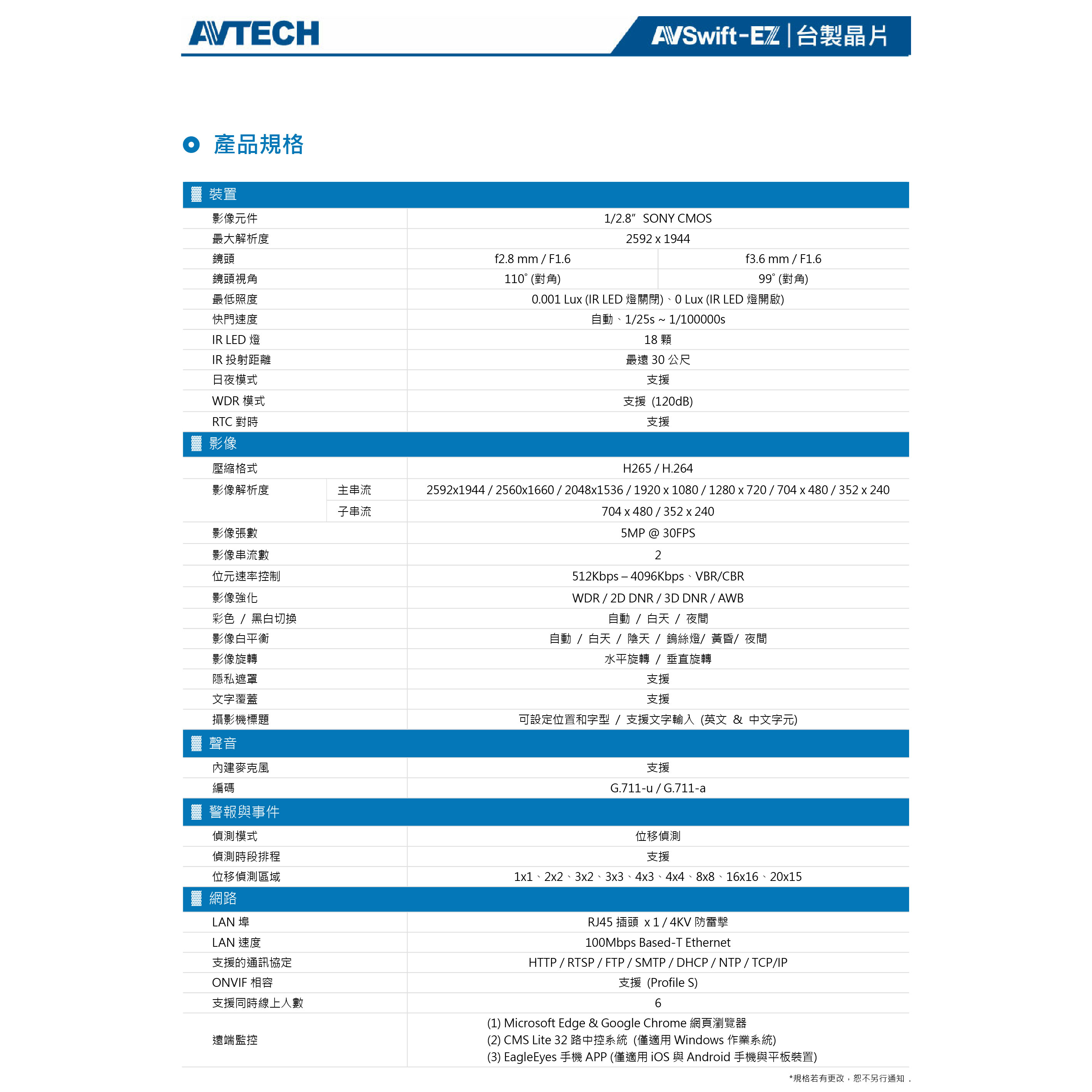 昌運監視器 AVTECH陞泰 DGM5303SVT 500萬畫素 紅外線半球型網路攝影機 內建麥克風