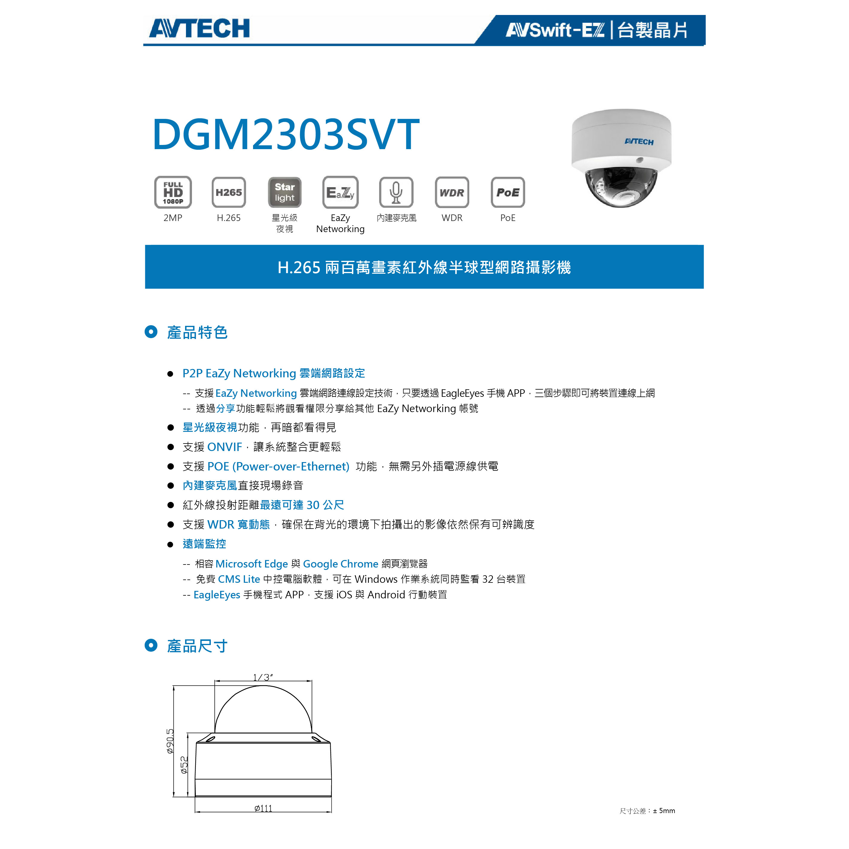 昌運監視器 AVTECH陞泰 DGM2303SVT 200萬畫素 紅外線半球型網路攝影機 內建麥克風