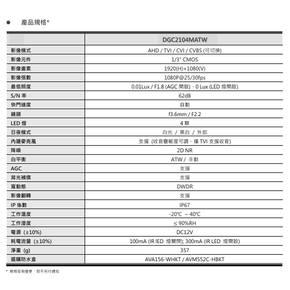 昌運監視器 AVTECH 陞泰 DGC2104MATW (DGC2105ATW) 2MP 4合1 全彩槍型攝影機 內建白光LED燈