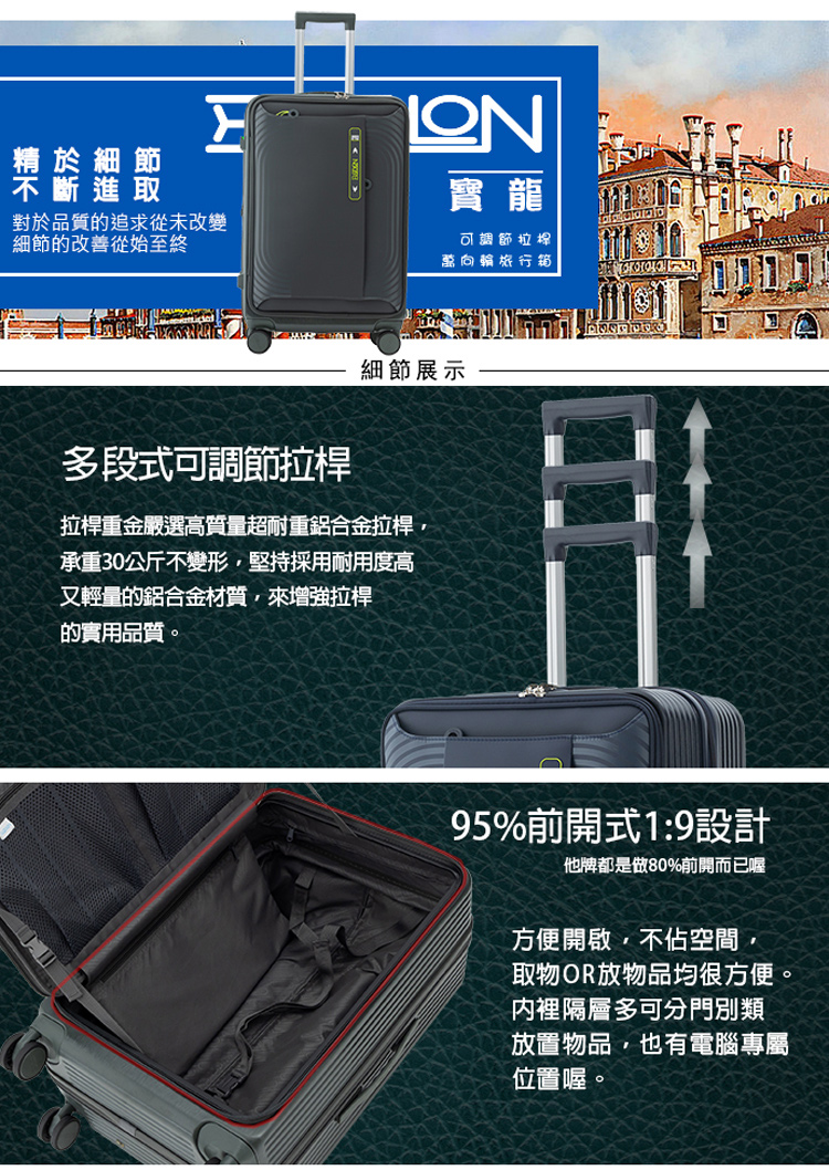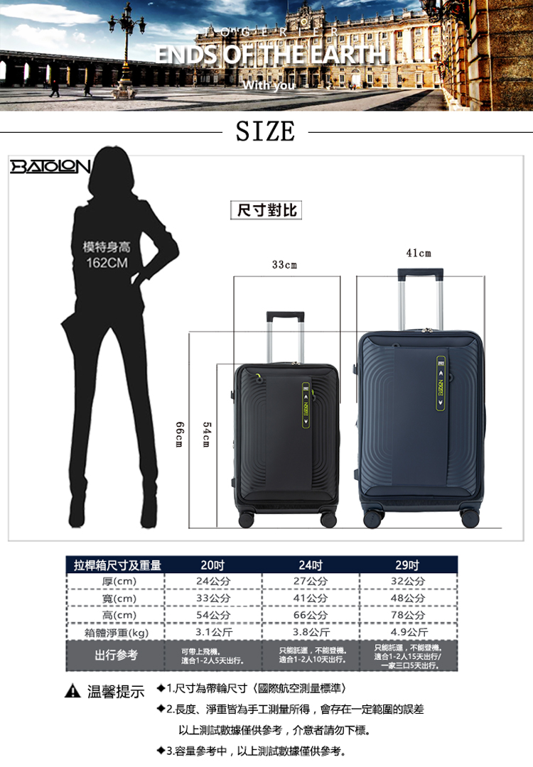 ◆尺寸(長*厚*高,含輪高):20吋/約33*24*54cm、24吋/約41*27*66cm、28吋/約48*32*78cm