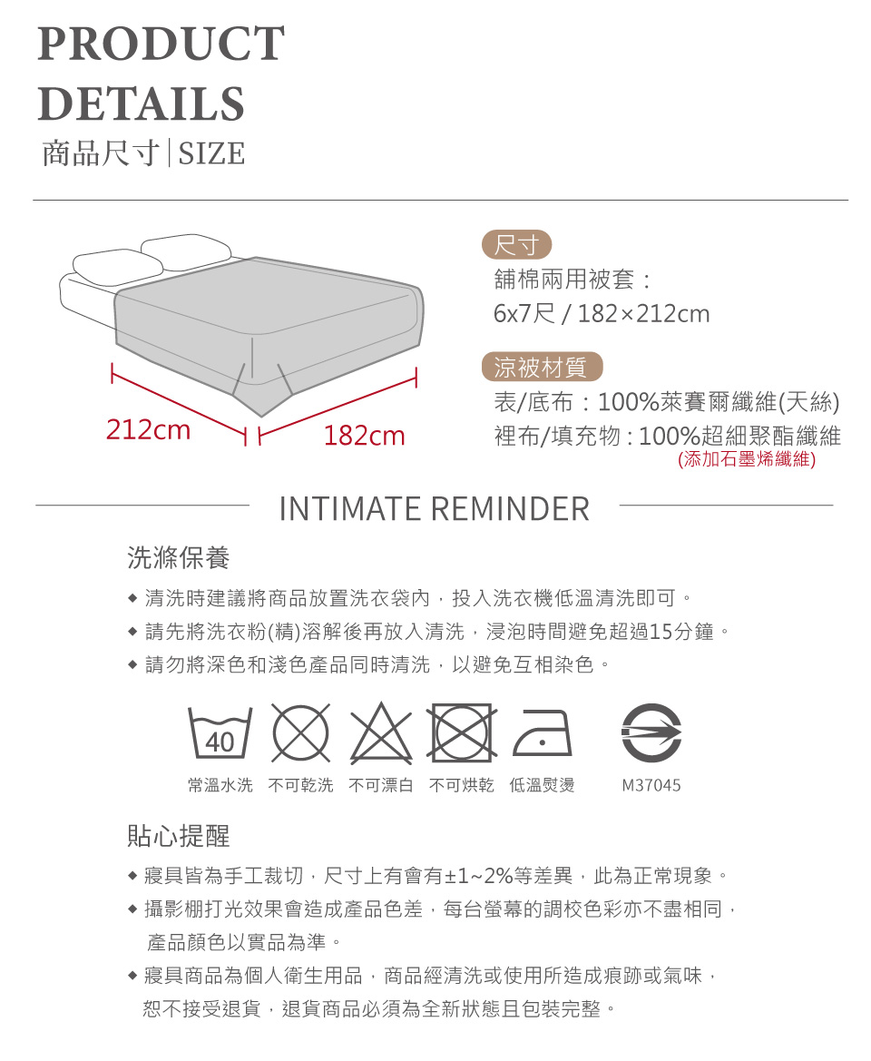 ◆ 商品材質: .表布/底布 : 100%萊賽爾纖維(天絲).裡布/填充物 : 100%超細聚酯纖維(添加石墨烯纖維).產地:中國(台商監製).顏色-如產品圖示,網頁圖片因拍攝關係,與實品略有差異,實際顏色及款式以出貨為主.因布料裁切位置的不同,部份花版可能會與商品圖略有出入,請以收到的實品為主◆清潔保養方式:可水洗/不可烘乾/不可漂白/勿使用強力漂白清潔劑/浸泡時間請勿超過20分鐘/建議可放入大型洗衣袋後再清洗◆注意事項:.注意事項一:商品如經拆封、使用過、清洗過或拆解以致缺乏完整性及失去再販售價值時,恕不接受退換貨!.注意事項二:此商品圖為參考用之情境圖示,產品內容以規格敘述內容為準.注意事項三:因布料裁切位置的不同,部份花版可能會與商品圖略有出入,請以收到的實品為主,網頁圖片因拍攝與螢幕解析度關係,與實品略有差異,實際顏色以出貨為主.注意事項四:請勿以粗糙之衣物(如竹蓆、釘釦..等)或身體皮膚粗糙部位直接磨擦布面,以免造成布面起毛球/繡線脫落之狀況,刺繡款有尾線頭,為正常現象,請勿剪除。.注意事項五:商品若欲辦理退款依法需先恢復商品原狀,否則需支付恢復商品原狀之費用方得辦理退款。(新品瑕疵除外)。.注意事項六:商品退換貨,需有外包裝破壞袋包覆,如商品提袋包裝汙損將無法退換貨,需另補償整新費。.注意事項七:為了保障雙方權益,請在拆封過程中務必全程錄影,以確保商品是否遺漏、缺貨、瑕疵品(商品缺件、汙漬)等,包裹/商品有問題請於7天商品鑑賞期內,附上完整錄影檔為依據告知,逾期恕不予受理!.注意事項八:送達地點有否限制:限台灣本島地區,外島恕不接單