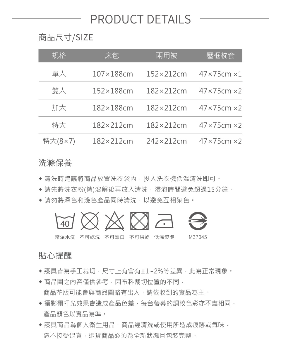 ◆清潔保養方式:可水洗/不可烘乾/不可漂白/勿使用強力漂白清潔劑/浸泡時間請勿超過20分鐘/建議可放入大型洗衣袋後再清洗(因深色布料請勿使用含漂白劑之洗劑,盡量避免浸泡,深淺色寢具請分開清洗) 請使用寢具專用洗衣袋清洗◆注意事項: