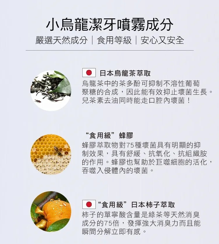 ◎立即讓口氣清新同時幫助保健牙齒 ◎降低牙齒疾病發生機率 幫助口腔健康 ◎添加日本進口的烏龍茶萃取 可減少口腔問題形成 ◎食用級蜂膠成分天然 幫助減緩牙菌斑形成的機率,及舒緩牙齦問題 ◎日本進口食品級柿子萃取 立即消除口臭又安全! ◎120ml外出瓶,方便攜帶噴噴沒煩惱! 不用擔心不受控的狗狗喵喵怎麼刷牙!!獨立幫毛孩刷牙超Easy~使用天然甘草及烏龍茶萃取,毛孩舔到也不擔心~ ═══ MIT 台灣製造,好安心 ═══ ❶ 牙膏即牙刷|使用超 Easy ❷ 減少牙垢|甘草及烏龍茶萃取 ❸ 去除口臭|柿子萃取+蜂膠 ❹ 口腔黏膜保濕|醣基海藻糖 ❺ 安全刷毛|矽膠柔軟而耐咬 ❻ 簡單清洗|避免壞東西孳生 ❼ 汪喵適用|適合不同體型毛孩 ●單支有效期限在彩色卡片上,建議毛拔麻請不要丟喔!