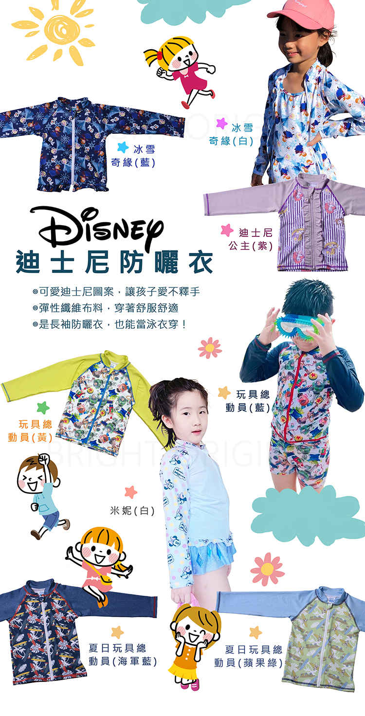 可愛迪士尼圖案,讓孩子愛不釋手彈性纖維布料,穿著舒服舒適是長袖防曬衣,也能當泳衣穿!第一次使用請下水清洗,洗衣機洗滌時裝入洗衣袋品名 : 迪士尼防曬衣材質 : 88% 聚酯纖維+12% 彈性纖維尺寸 : 90 (身長90cm) 100 (身長100cm) 110 (身長105cm~110cm) 120 (身長110cm~125cm) 130 (身長125cm~130cm)產地 : 中國(日本設計)