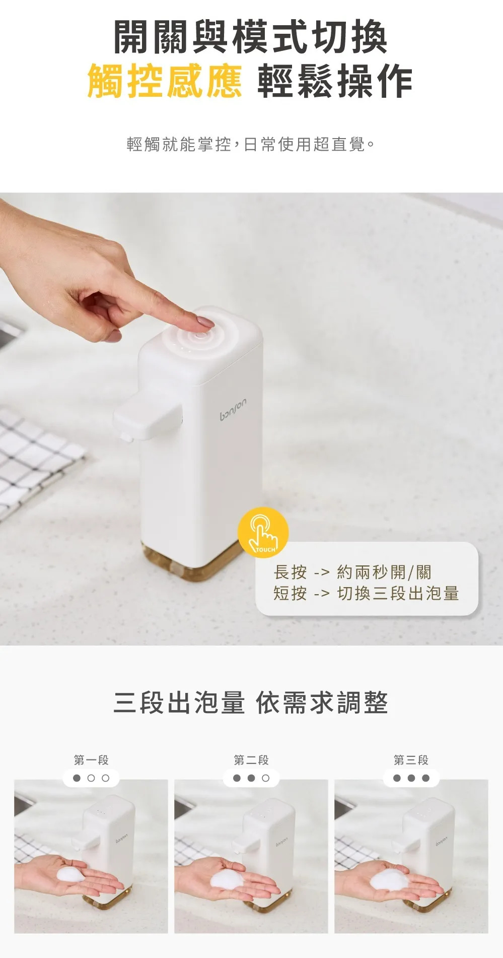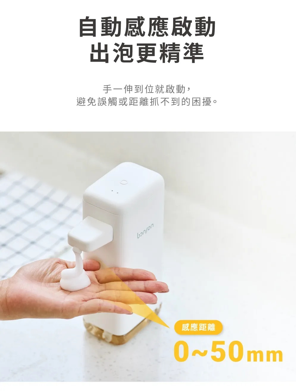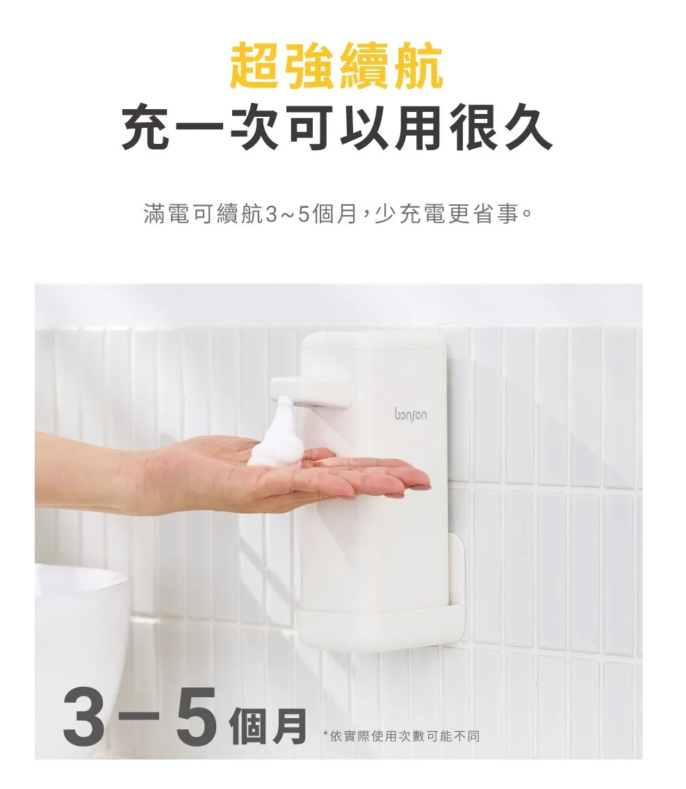 • 多場景適用,從日常洗手到料理後清潔。• 壁掛/桌面兩用,空間怎麼擺都適合。• 壁掛不佔檯面,清潔一抹就過,視覺更俐落。• 紅外線自動感應,零接觸更安心。• 三段出泡量,一台符合全家人的習慣。• 400ml 大容量,一次加滿可用更久。• 超強續航 3–5 個月,充一次用很久。• IPX5 防水,放在水槽旁也安心。• 洗手液滋潤不緊繃,降低乾澀不適。