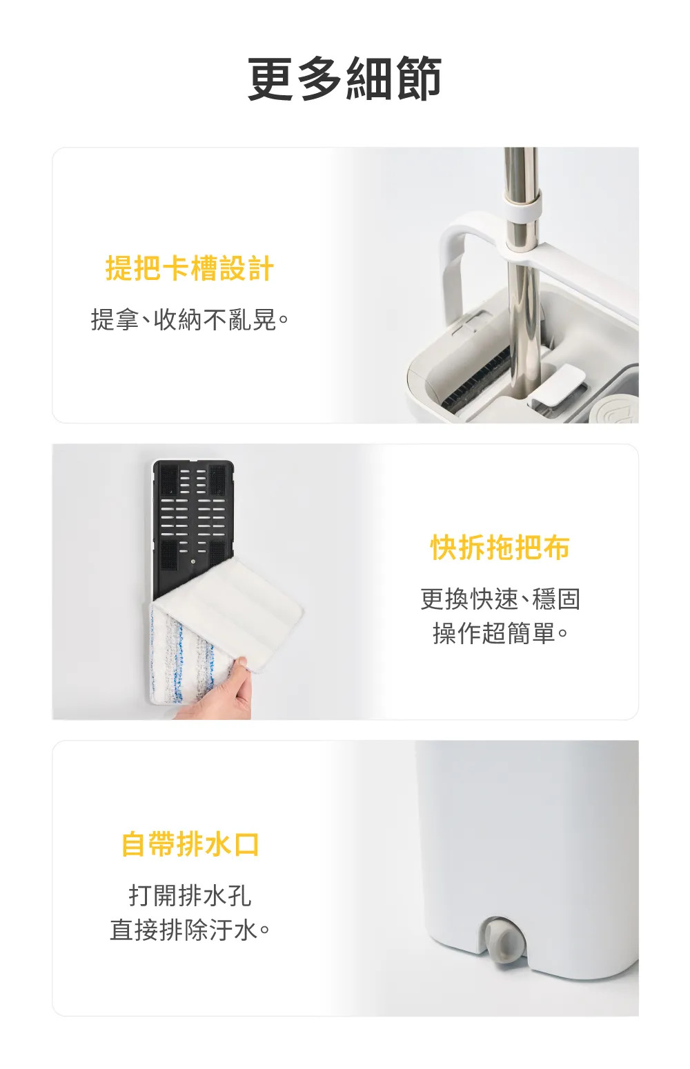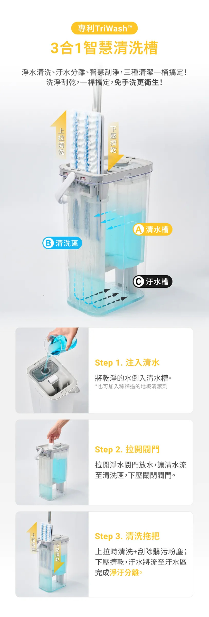 • 呵護家人健康,遠離地面細菌• 潔淨新科技,髒水清水分開,每次清洗都是乾淨的水。• 毛刷刮齒設計,毛髮不再黏拖把• 清潔水漬、油漬、泡沫...通通難不倒!!• 省時省力又環保,不用來回換水,懶人必備。• 居家清潔好幫手,限水日也能輕鬆掃• 環保節水輕鬆洗,轉一次約20克水,拖地一次只需2.2L水,每天節約7.5L水,保護地球從小事做起。