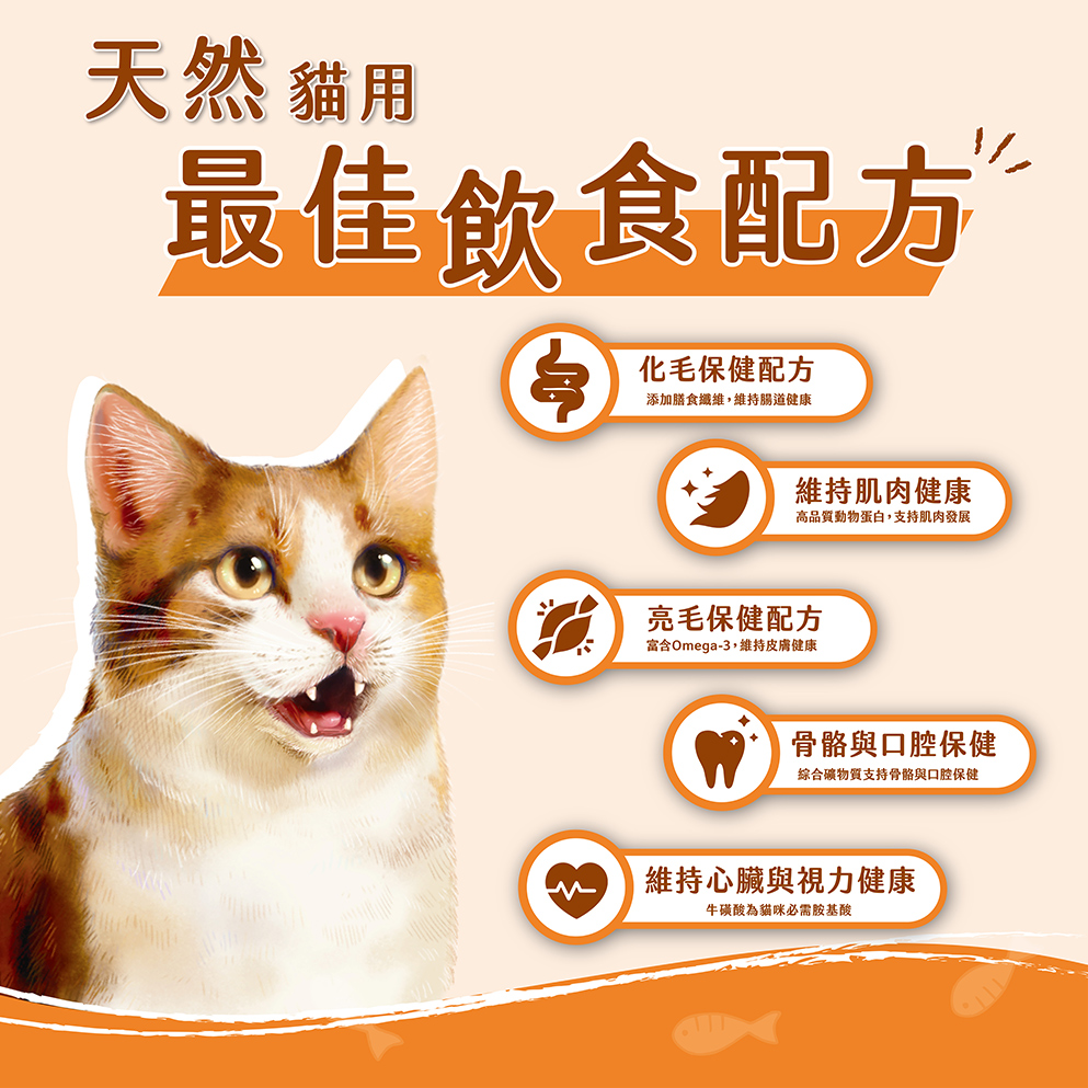 粗蛋白:不低於 30.0%、粗脂肪:不低於 10.0%、粗纖維:不高於 5.0%、灰分:不高於 9.0%、水分:不高於 10.0%、鈣:不低於 1.1%、磷:不低於 0.7%、牛磺酸:不低於 0.10%、代謝能:3160 Kcal/kg
