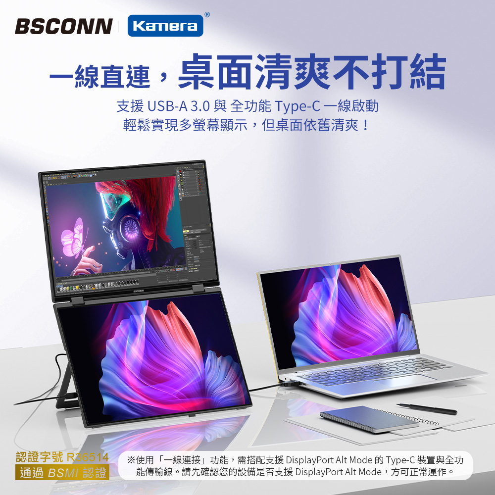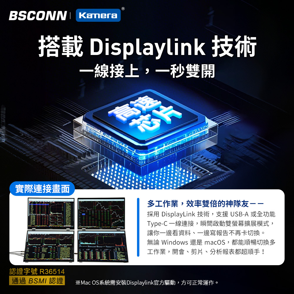 ● 搭載DisplayLink 技術,一線啟動雙螢模式,讓桌面更簡潔乾淨。支援 USB-A / Type-C 全功能連接,啟動雙螢幕擴展顯示,簡單易用。