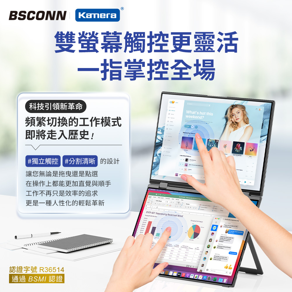 ● 一台摺疊螢幕,改變你的操作習慣。上下雙螢幕可獨立操作,互不干擾,不需要再滑鼠狂切畫面,讓你一邊簡報、一邊瀏覽資料;剪片、寫程式、報表編輯效率翻倍。不是只能辦公,也能隨時開玩。相較傳統外接螢幕,加入觸控功能,大幅降低滑鼠操作頻率,實現更直覺、多工的使用體驗。
