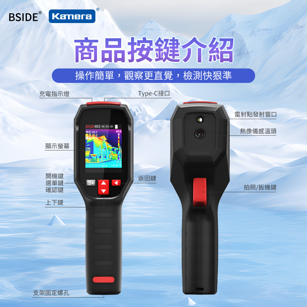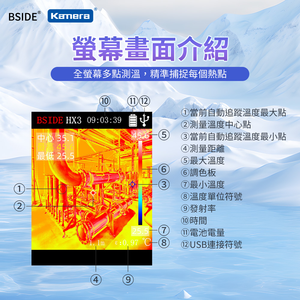 ● 非接觸即可輕鬆測溫!有效減少對技術人員產生的高低溫傷害。並且在難以測溫的場域中,例如:夜間或低光環境、高溫環境、隱藏或難以接觸的設備,BSIDE 艾默 HX3 紅外線熱成像儀● 仍然能夠偵測熱源,提供可視化的溫度分布。