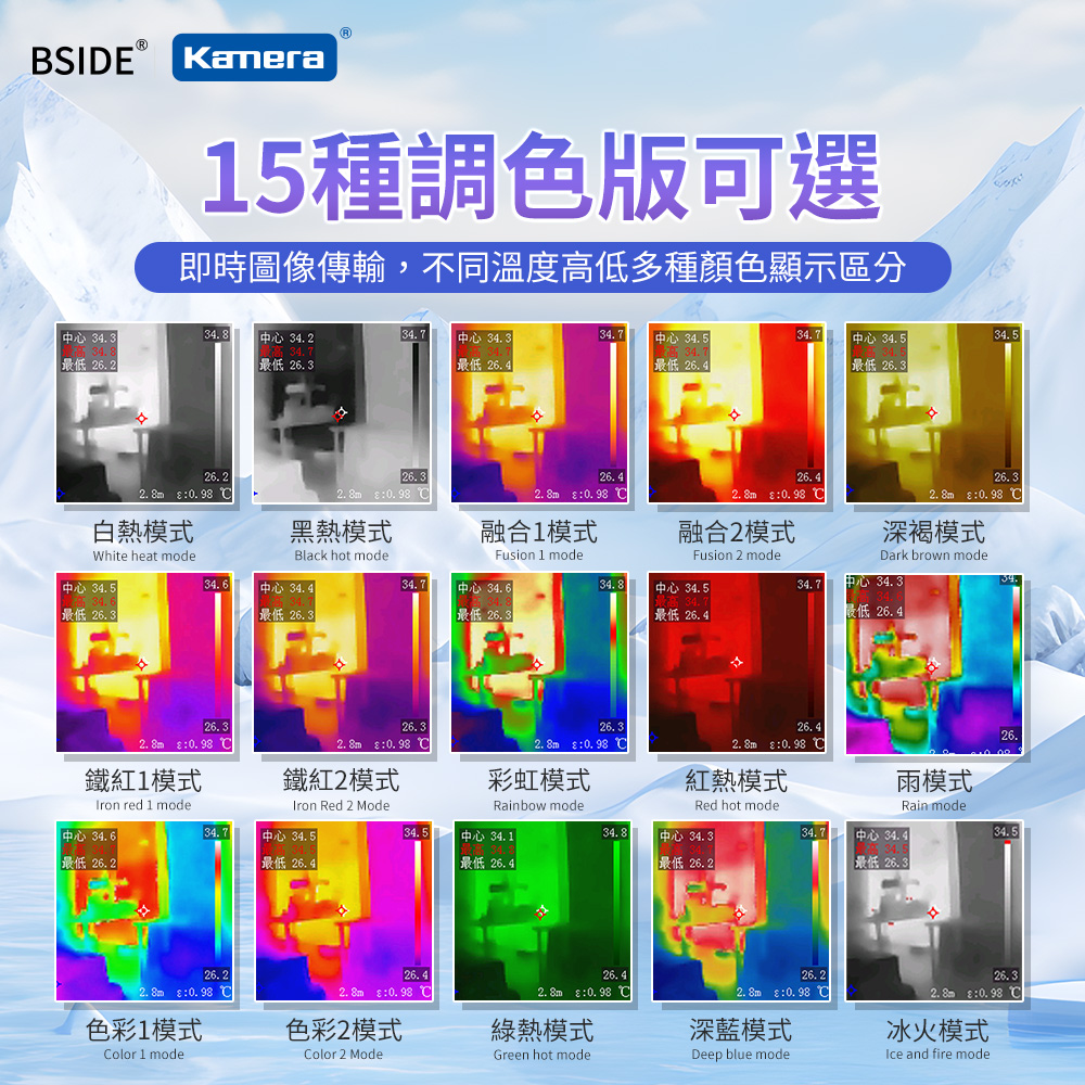 ● 提供15種偽彩模式,透過不同的色彩映射和對比度調整,幫助技術人員更好識別和分析熱影像中的溫度分佈和變化。