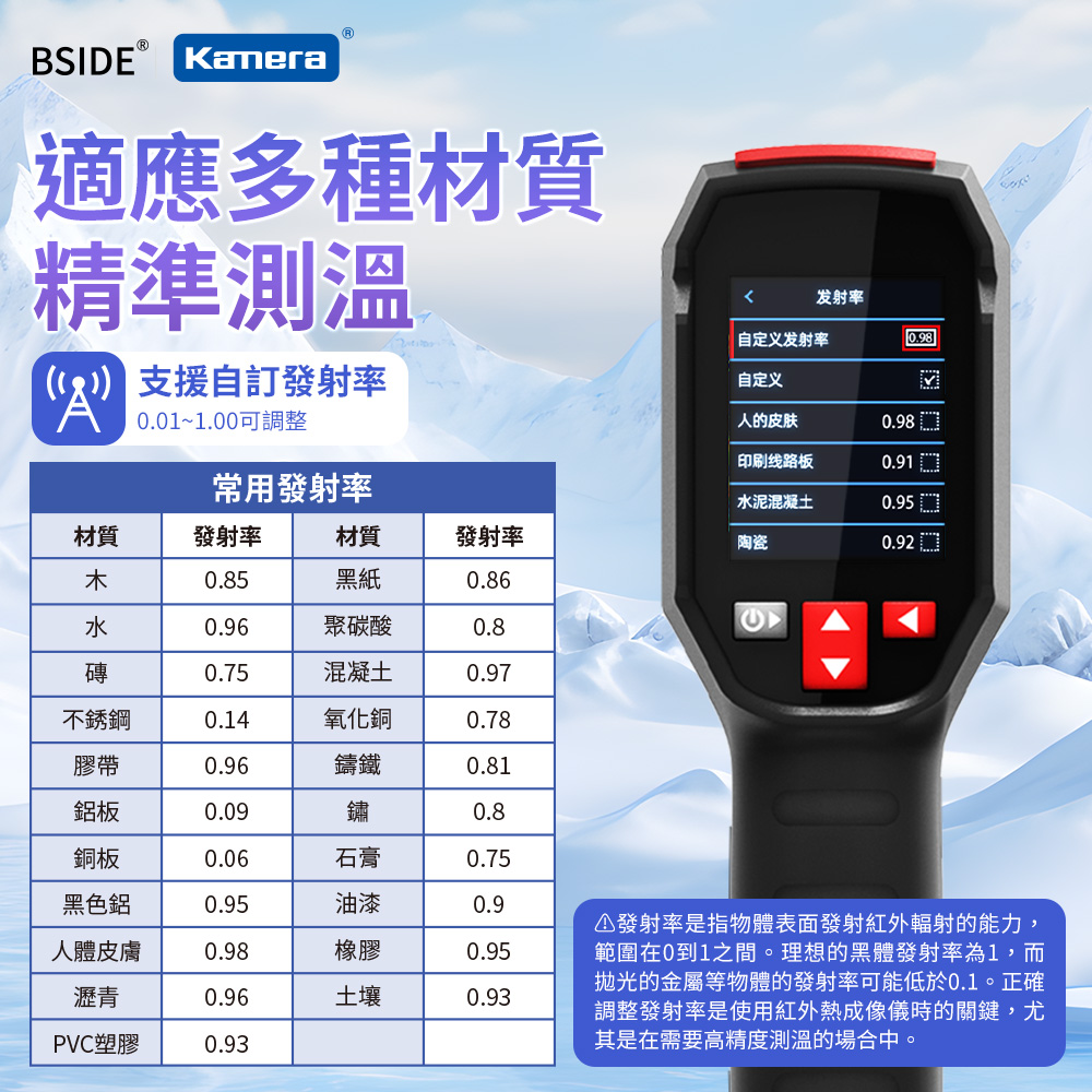 ● 支援自訂調整發射率0.01~1.00,適應多種材質,提高測量準確性。