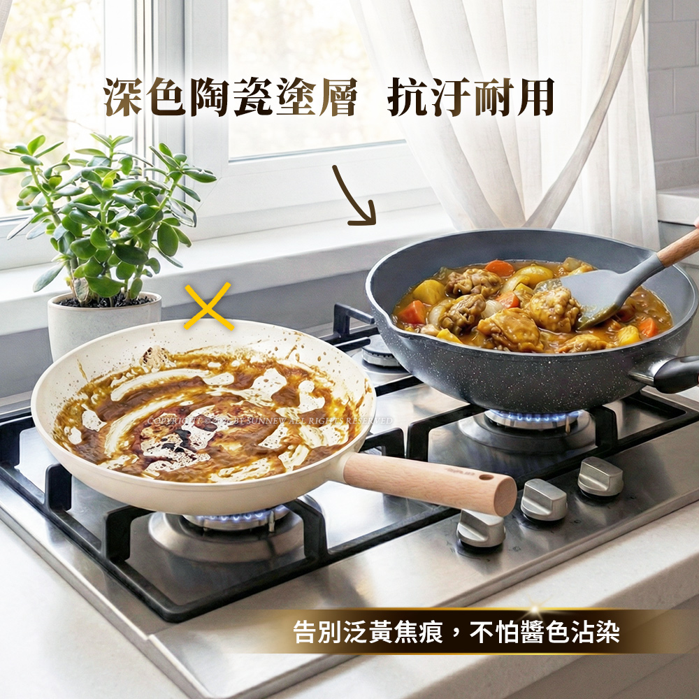 【Buffalo牛頭牌】小牛石英陶瓷不沾平圓炒鍋26cm(雙導角/不含PFOA,PFAS/塑化劑檢測通過/瓦斯爐.IH爐適用)