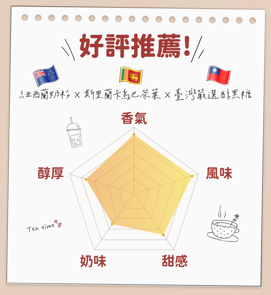 經典奶茶: 全脂奶粉、奶精(葡萄糖漿、完全氫化椰子油、牛奶蛋白、磷酸氫二鉀、多磷酸鈉、脂肪酸甘油酯、單及雙脂肪酸甘油二乙醯酒石酸酯、辛烯基丁二酸鈉澱粉、二氧化矽、β-胡蘿蔔素)、細糖、菊糖、紅茶粉(含研磨紅茶粉)、阿拉伯糖、藤黃果萃取物、白腎豆萃取物、啤酒酵母胜肽(啤酒酵母抽出物、糊精) 蒟蒻珍珠: 水、高果糖糖漿、砂糖、葡萄糖、鹿角菜膠、蒟蒻粉、海藻酸鈉、果膠、乳酸鈣、檸檬酸、香料、刺槐豆膠、關華豆膠、玉米糖膠、DL-蘋果酸、偏磷酸鈉、氯化鉀、焦糖色素(第四類)、磷酸二氫鈣、結蘭膠、氯化鈣、己二烯酸鉀(防腐劑)、甜味劑(醋磺內酯鉀、蔗糖素)、食用紅色四十號、食用黃色四號、食用藍色一號