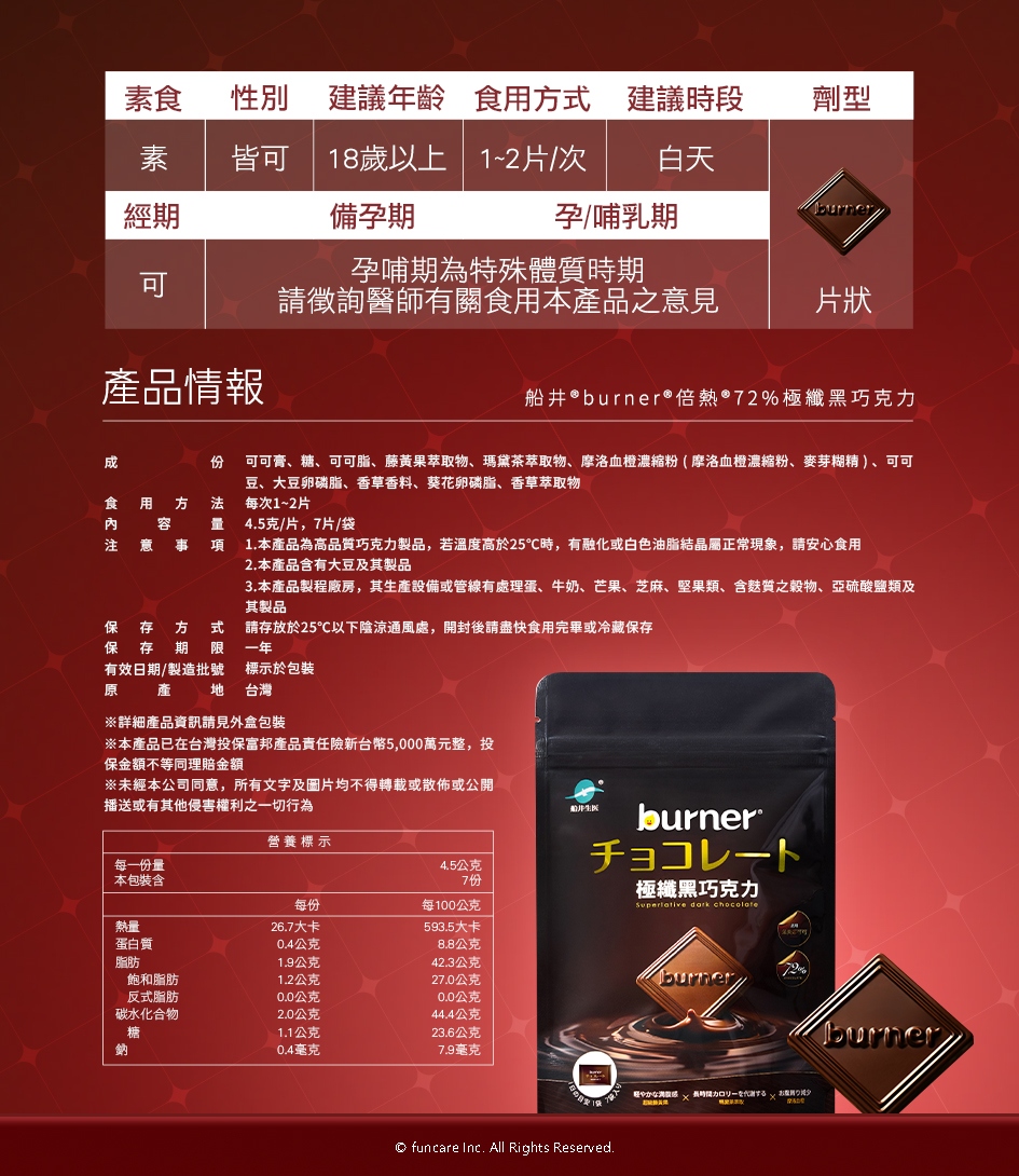 【船井】burner倍熱 72%極纖黑巧克力(7片/袋)-購買數量請選擇雙數